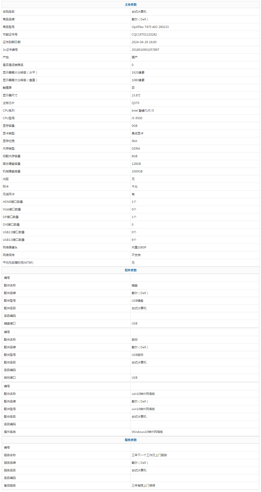 - 商品名稱:戴爾(Dell) OptiPlex 7470 AIO 260233 Intel 酷睿九代 i5 i5-9500 8GB 1000GB 128GB Windows10神州網(wǎng)信版 23.8寸 三年有限上門保修