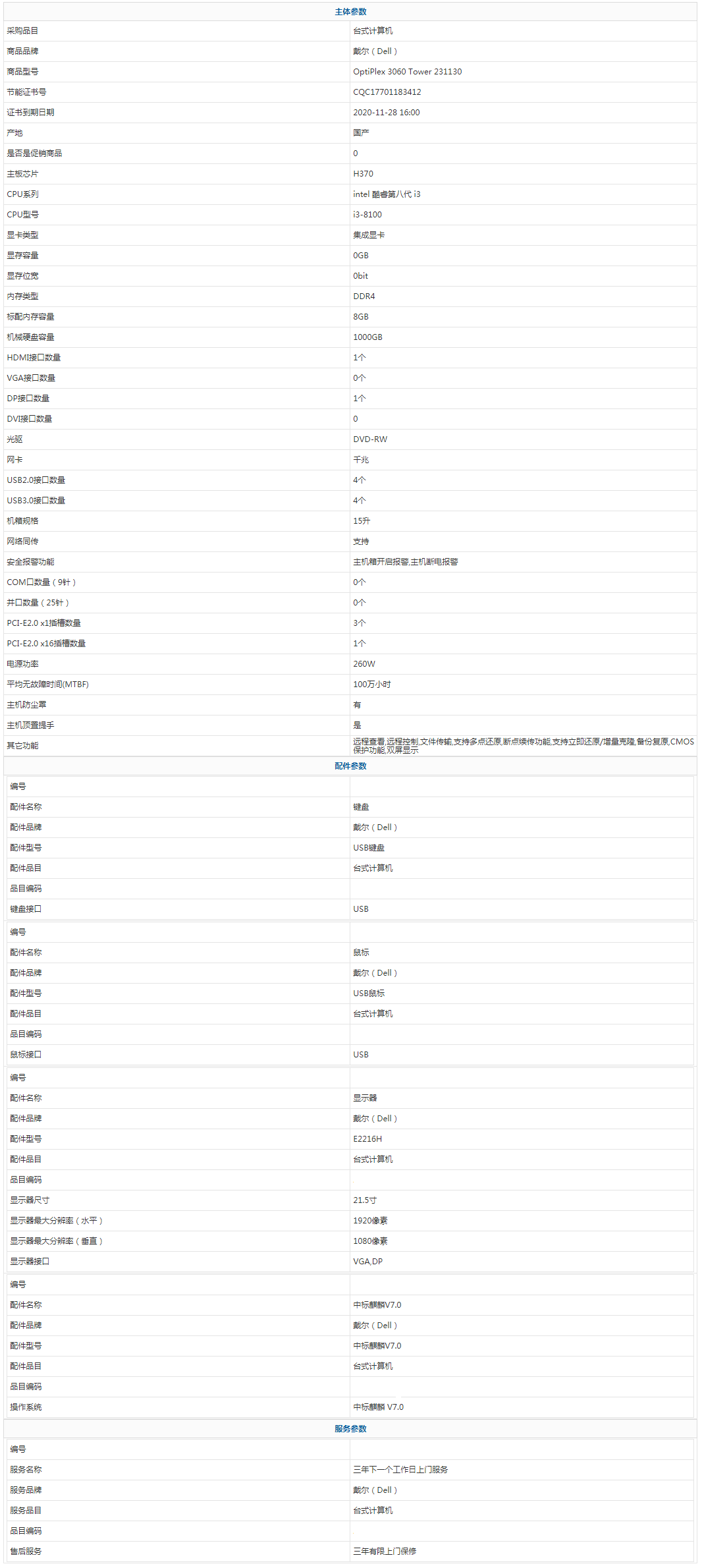 - 商品名稱:戴爾(Dell) OptiPlex 3060 Tower 231130 intel 酷睿第八代 i3 i3-8100 8GB 1000GB 中標(biāo)麒麟 V7.0 21.5寸 三年有限上門保修