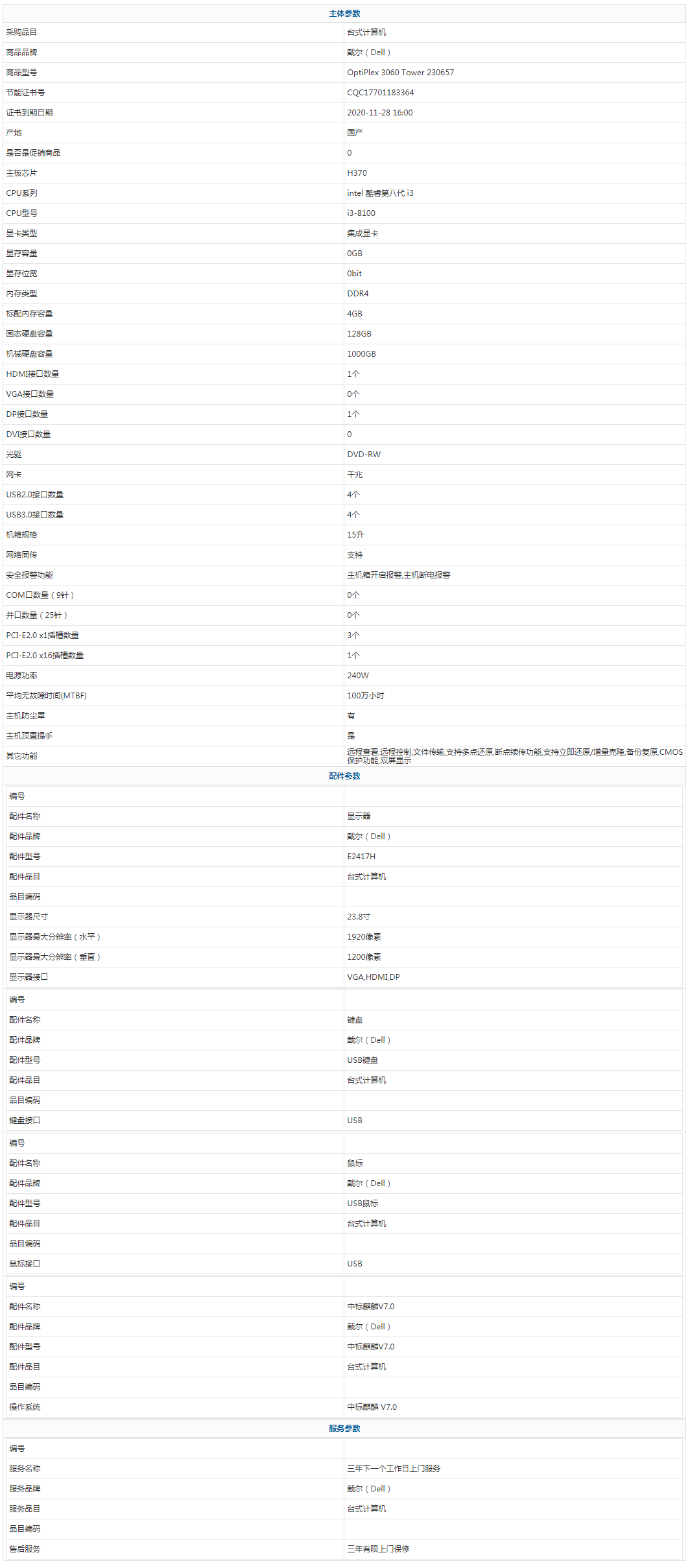 - 商品名稱(chēng):戴爾(Dell) OptiPlex 3060 Tower 230657 intel 酷睿第八代 i3 i3-8100 4GB 1000GB 128GB 中標(biāo)麒麟 V7.0 23.8寸 三年有限上門(mén)保修