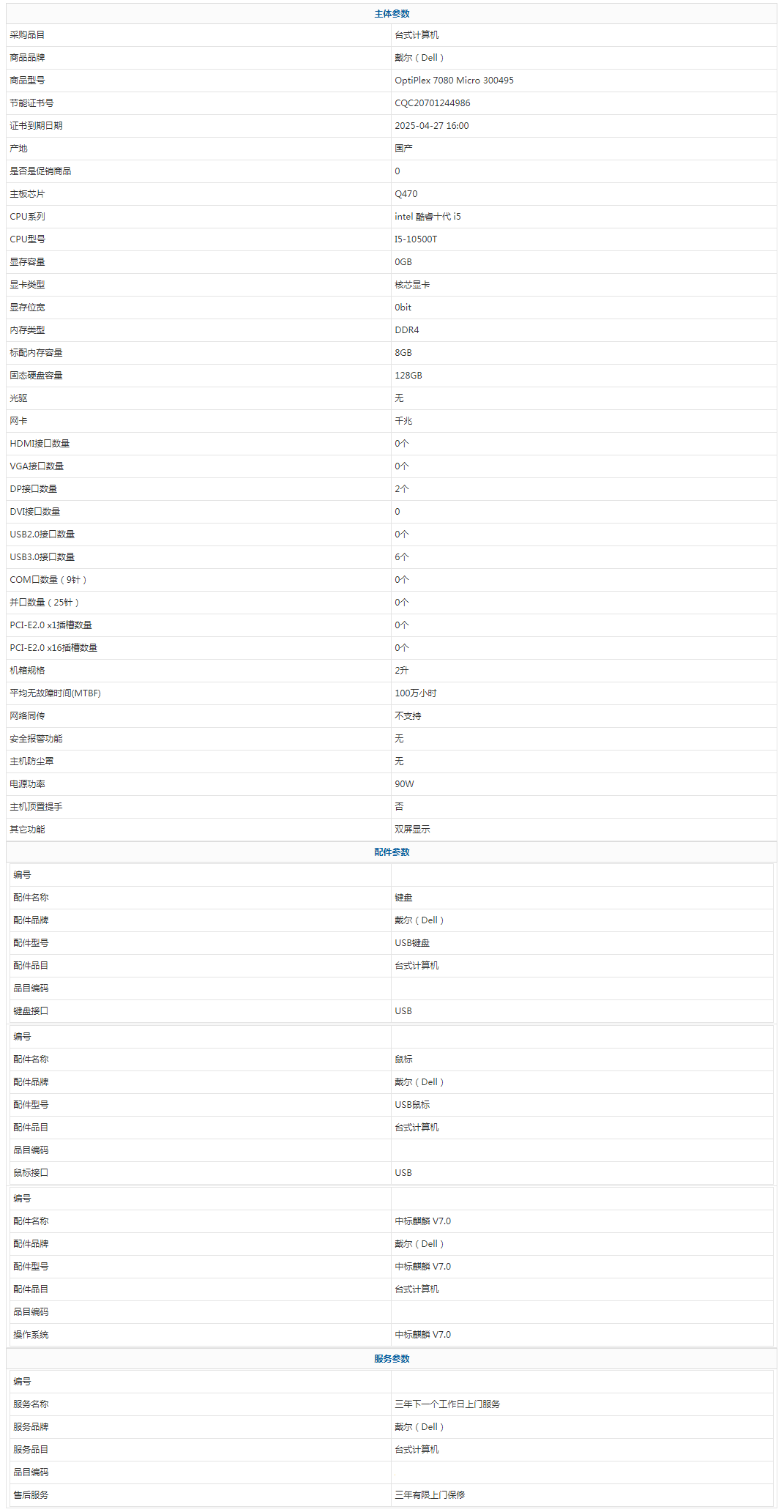 • 商品名稱:戴爾(Dell) OptiPlex 7080 Micro 300495 intel 酷睿十代 i5 I5-10500T 8GB 128GB 中標(biāo)麒麟 V7.0 三年有限上門保修
