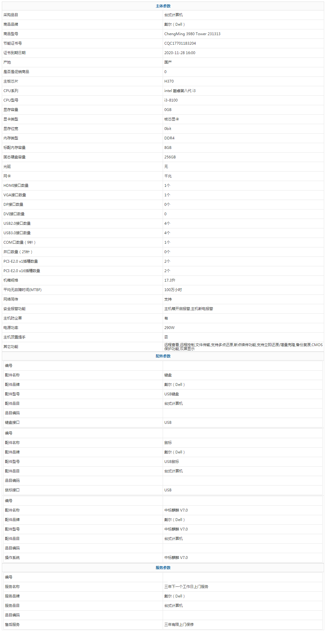 - 商品名稱:戴爾(Dell) ChengMing 3980 Tower 231313 intel 酷睿第八代 i3 i3-8100 8GB 256GB 中標(biāo)麒麟 V7.0 三年有限上門保修