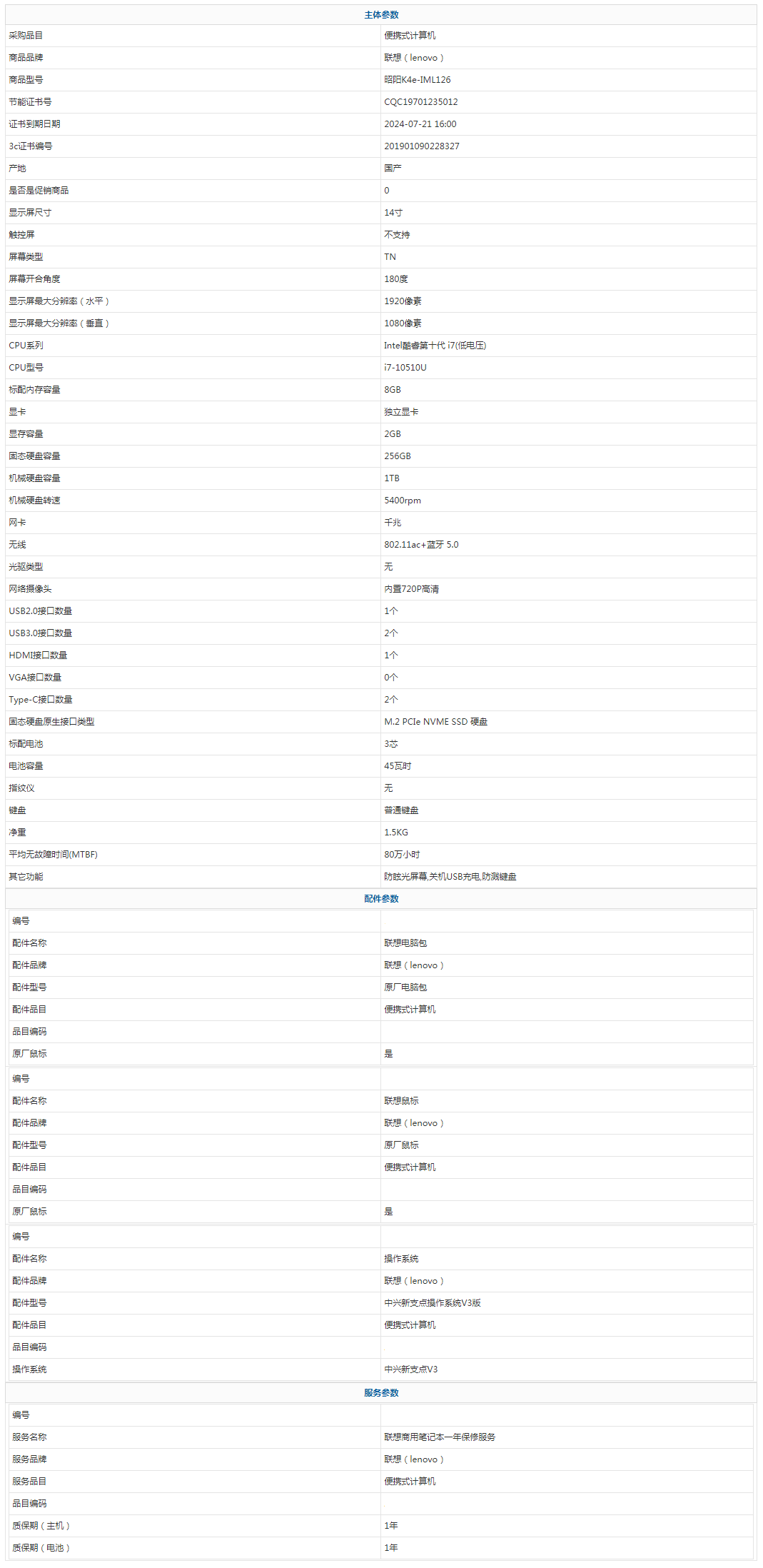 聯(lián)想(lenovo) 昭陽K4e-IML126 Intel酷睿第十代 i7(低電壓) i7-10510U 8GB 1TB 256GB 中興新支點(diǎn)V3 14寸 1年