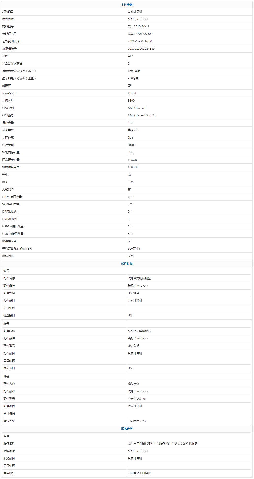 - 商品名稱:聯(lián)想(lenovo) 啟天A530-D042 AMD Ryzen 5 AMD Ryzen5 2400G 8GB 1000GB 128GB 中興新支點(diǎn)V3 19.5寸 三年有限上門保修