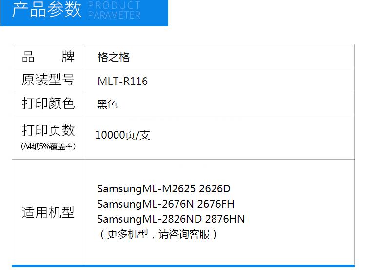 • 商品名稱:格之格MLT-R116硒鼓組件適用三星SL-M2626 2626D 2676FH 2826ND硒鼓 NT-DS116一支裝