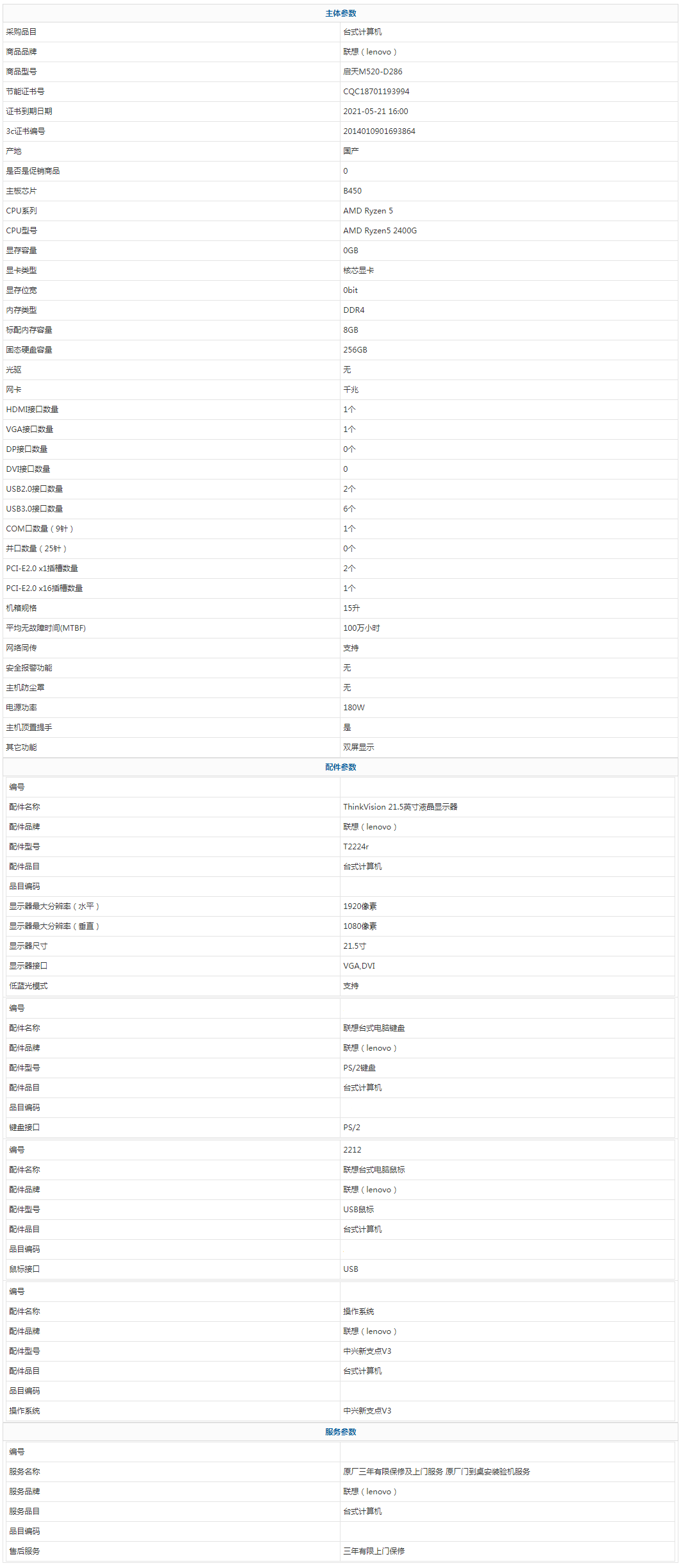 - 商品名稱:聯(lián)想(lenovo) 啟天M520-D286 AMD Ryzen 5 AMD Ryzen5 2400G 8GB 256GB 中興新支點(diǎn)V3 21.5寸 三年有限上門保修