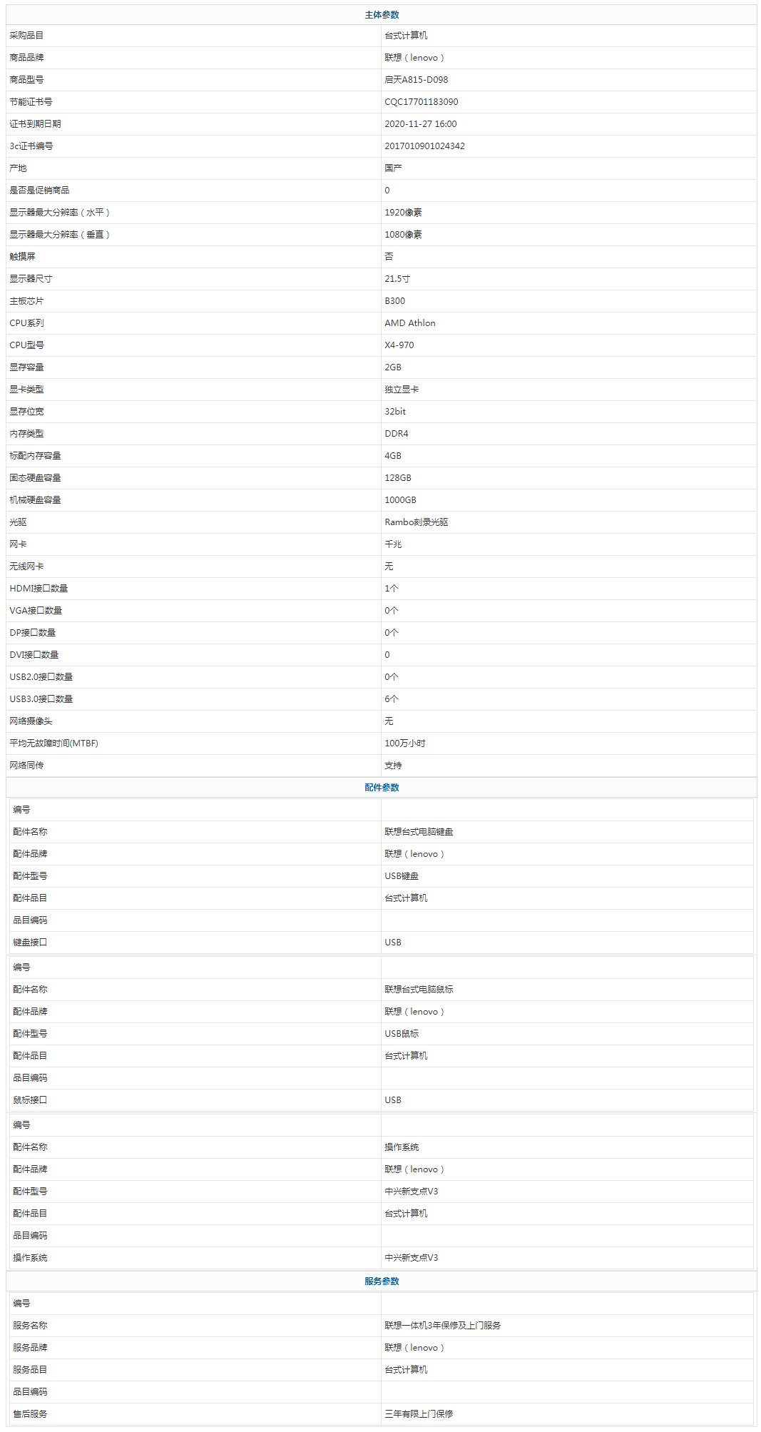 • 商品名稱:聯(lián)想(lenovo) 啟天A815-D098 AMD Athlon X4-970 4GB 1000GB 128GB 中興新支點(diǎn)V3 21.5寸 三年有限上門(mén)保修
