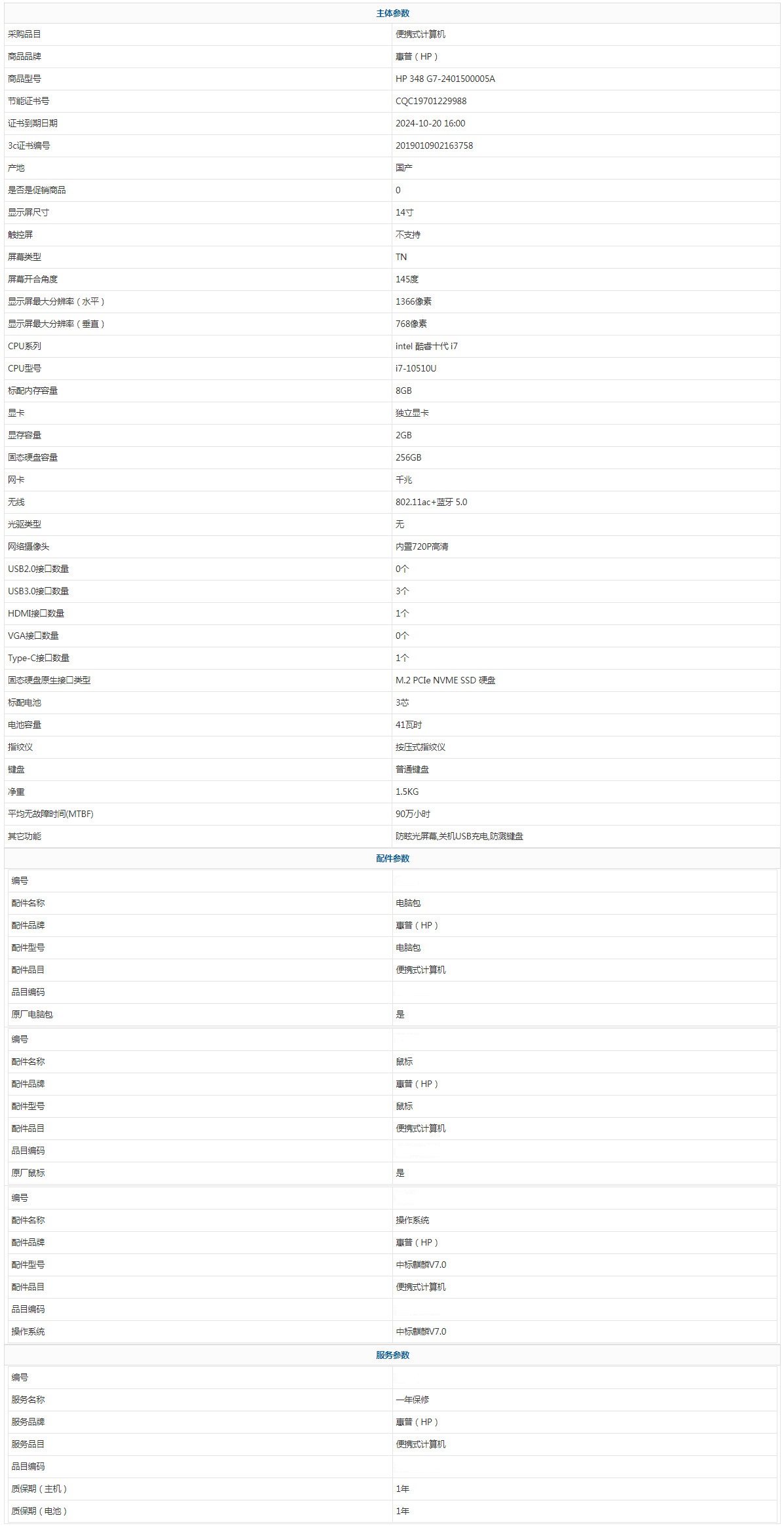 - 商品名稱:惠普(HP) HP 348 G7-2401500005A intel 酷睿十代 i7 i7-10510U 8GB 256GB 中標(biāo)麒麟V7.0 14寸 1年
