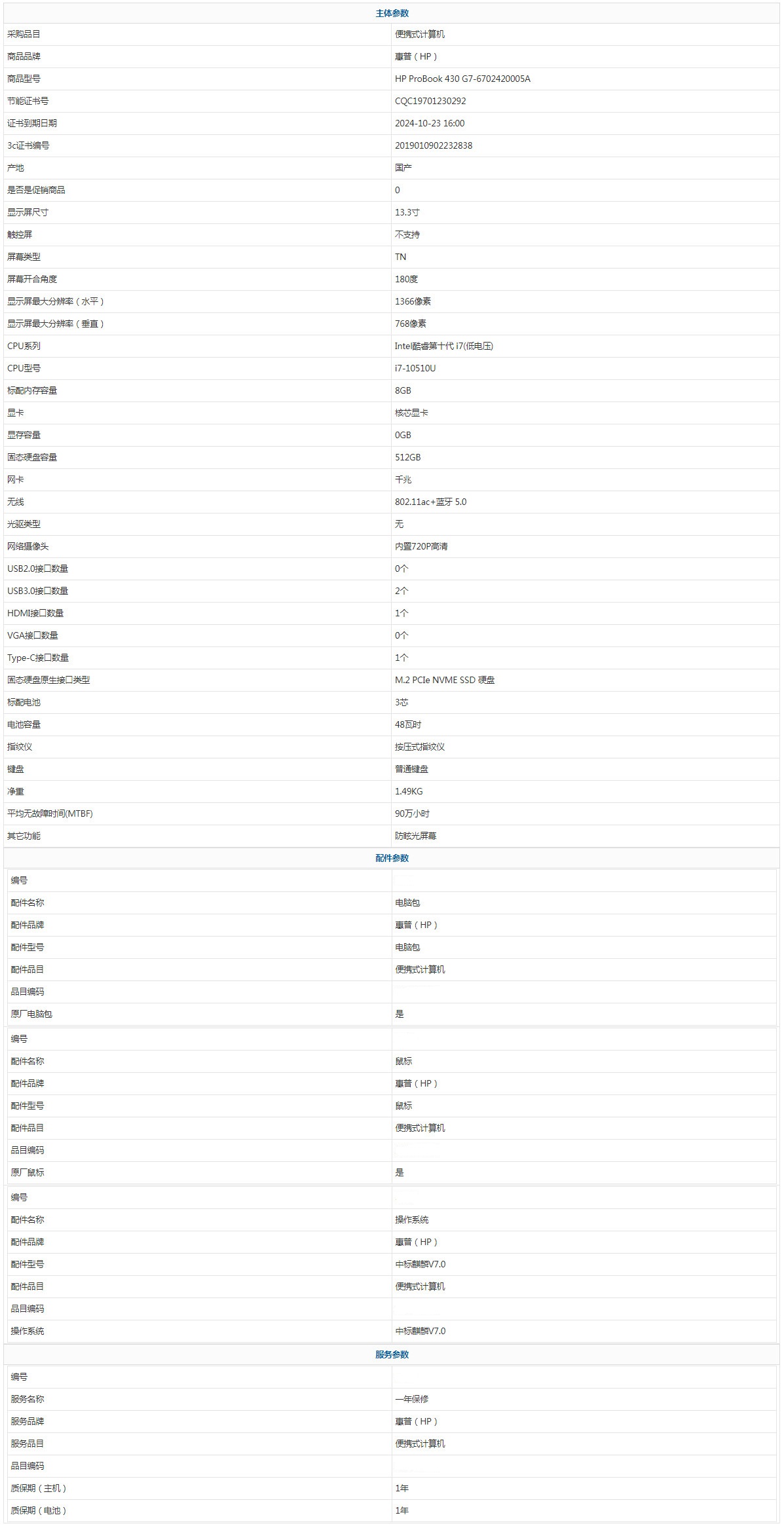 - 商品名稱:惠普(HP) HP ProBook 430 G7-6702420005A Intel酷睿第十代 i7(低電壓) i7-10510U 8GB 512GB 中標(biāo)麒麟V7.0 13.3寸 1年
