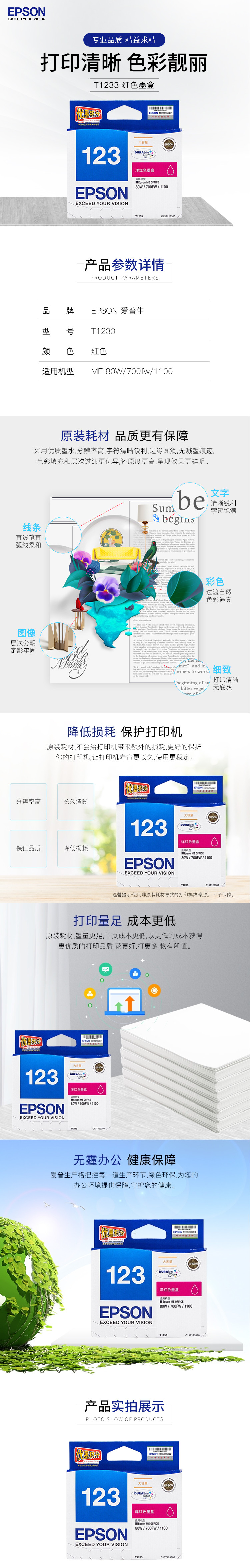 - 商品名稱(chēng):愛(ài)普生(EPSON)T1233 紅色墨盒 約875頁(yè) 適用ME 80W/700fw機(jī)型