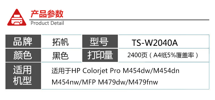 • 商品名稱(chēng):拓帆 TS-W2040A 黑色硒鼓 打印量約2400頁(yè) 適用HP M454dw/m454dn/m454nw/m479dw/479fnw