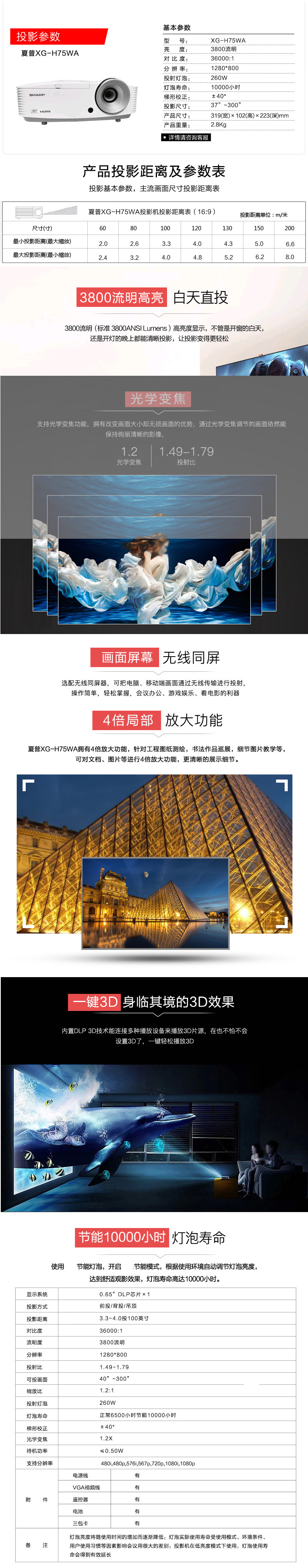 • 商品名稱:夏普(SHARP)XG-H75WA高清投影儀 3800流明 對比度36000:1 分辨率1280*800 白色
