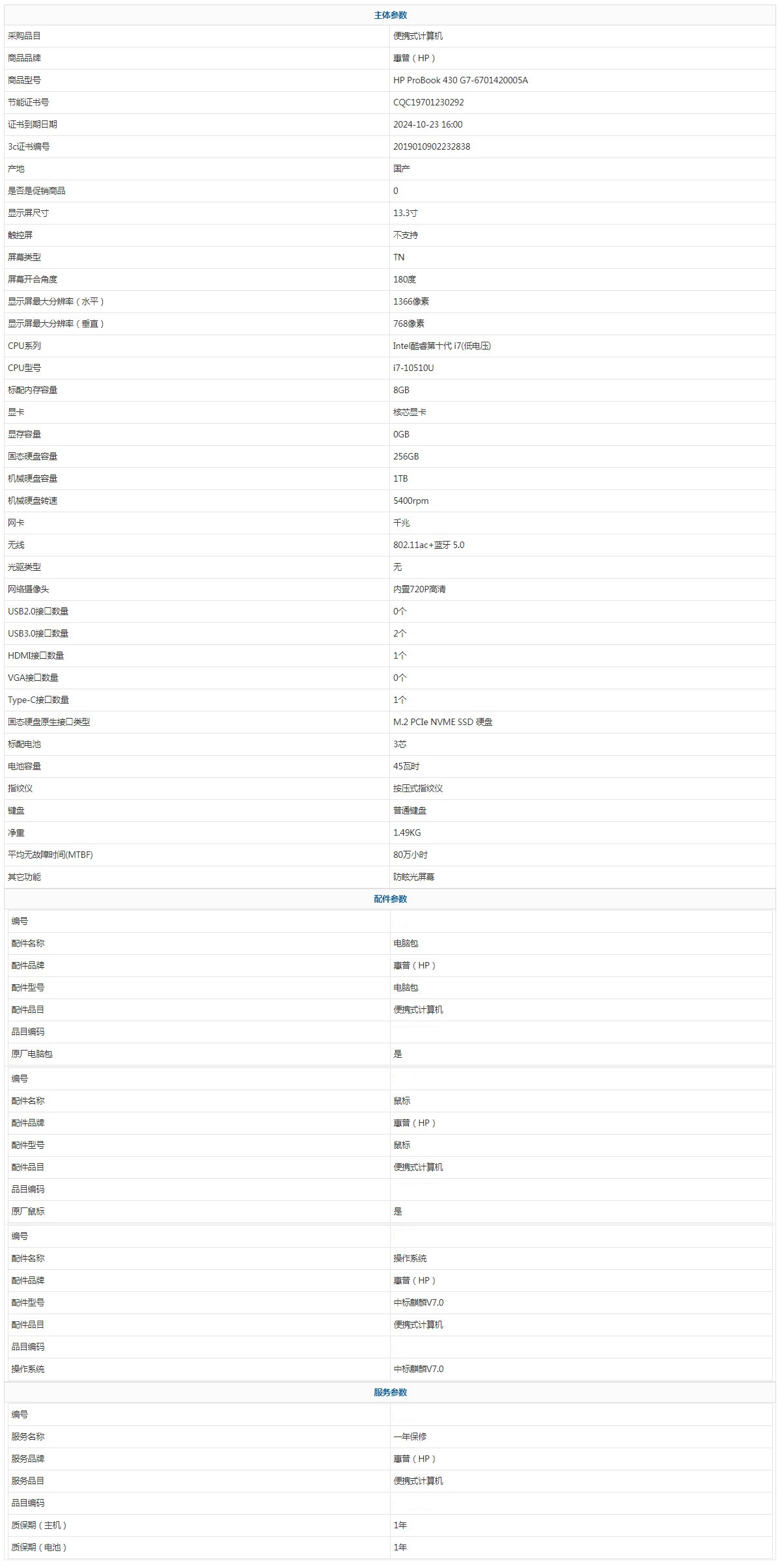 - 商品名稱:惠普(HP) HP ProBook 430 G7-6701420005A Intel酷睿第十代 i7(低電壓) i7-10510U 8GB 1TB 256GB 中標麒麟V7.0 13.3寸 1年