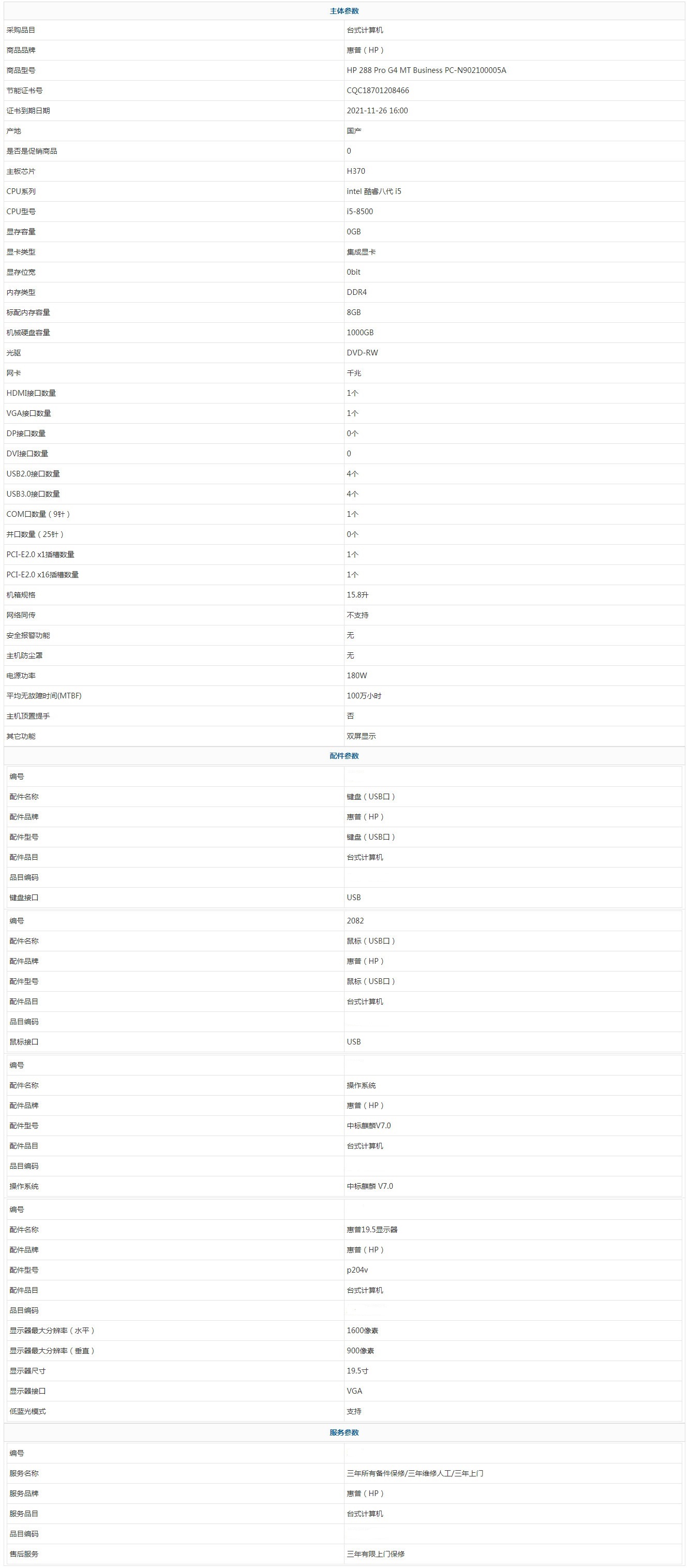 惠普(HP) HP 288 Pro G4 MT Business PC-N902100005A intel 酷睿八代 i5 i5-8500 8GB 1000GB 中標(biāo)麒麟 V7.0 19.5寸 三年有限上門保修