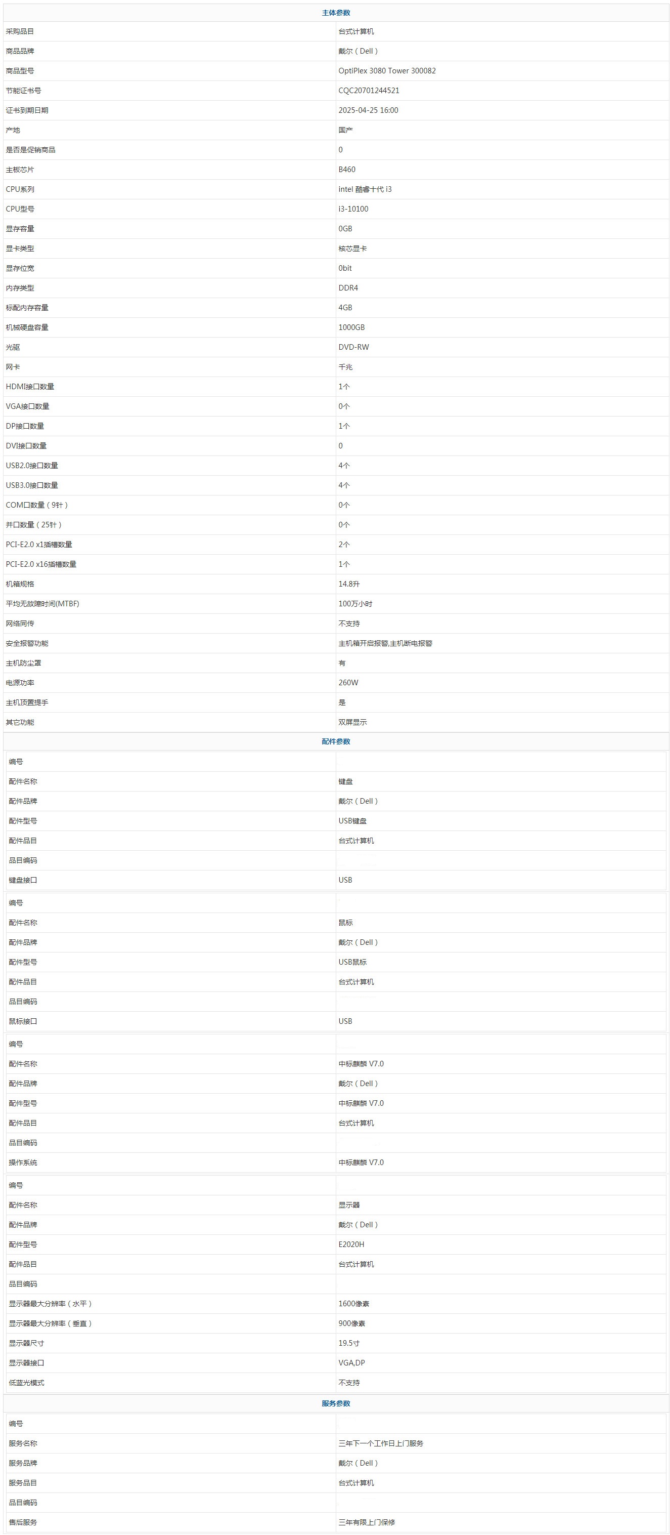 • 商品名稱:戴爾(Dell) OptiPlex 3080 Tower 300082 intel 酷睿十代 i3 i3-10100 4GB 1000GB 中標(biāo)麒麟 V7.0 19.5寸 三年有限上門保修