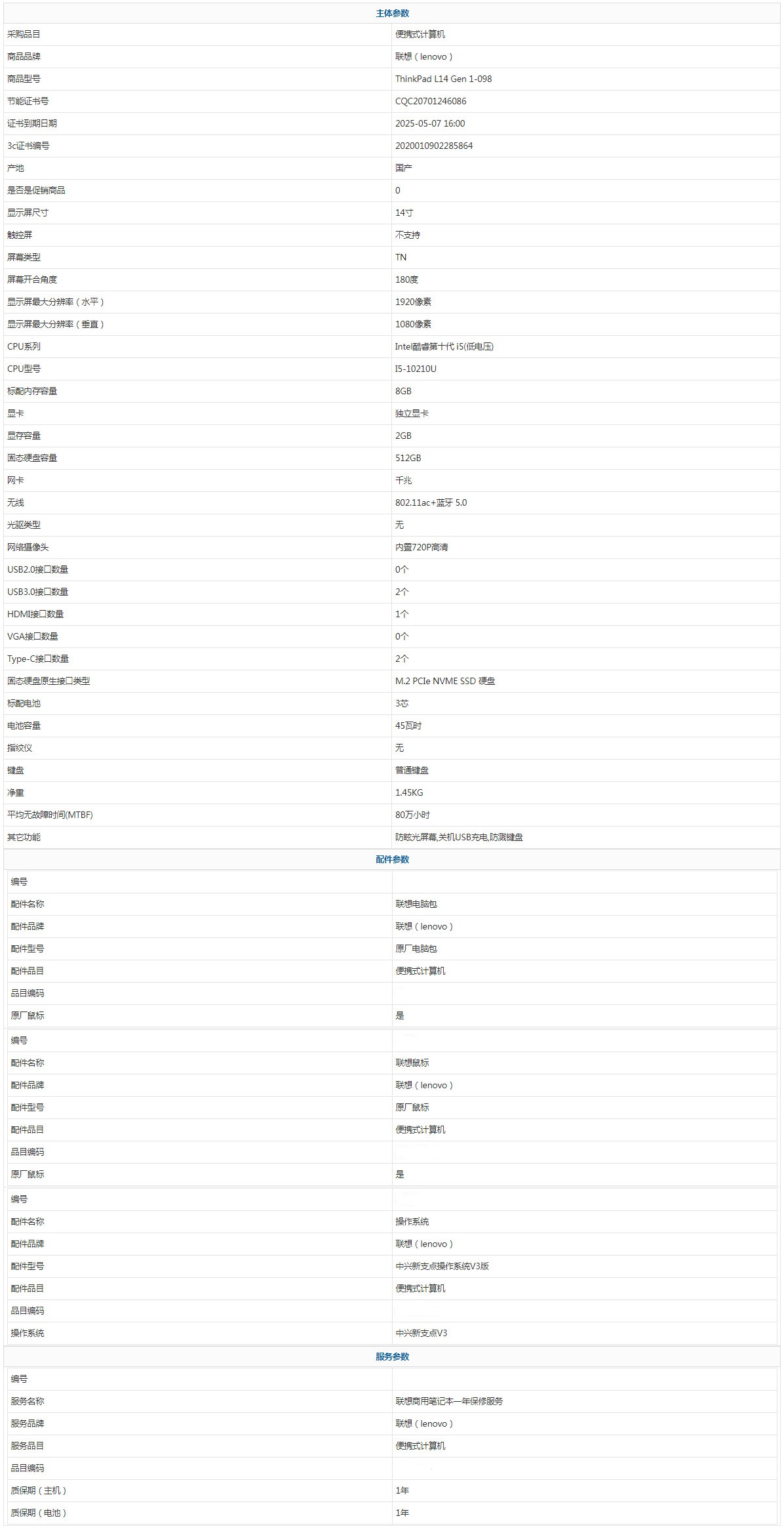 聯(lián)想(lenovo) ThinkPad L14 Gen 1-098 Intel酷睿第十代 i5(低電壓) I5-10210U 8GB 512GB 中興新支點(diǎn)V3 14寸 1年