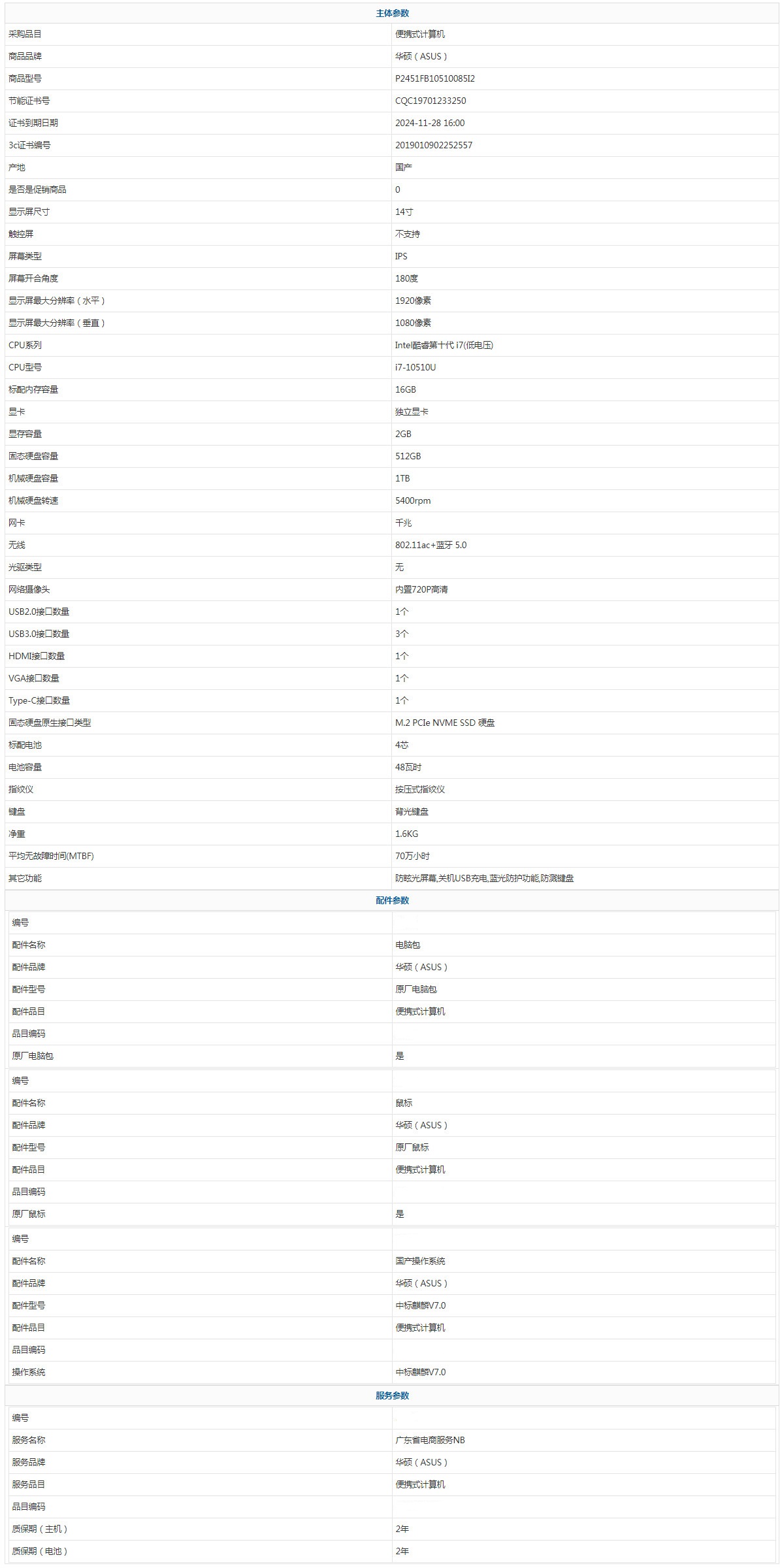 - 商品名稱:華碩(ASUS) P2451FB10510085I2 Intel酷睿第十代 i7(低電壓) i7-10510U 16GB 1TB 512GB 中標(biāo)麒麟V7.0 14寸 2年