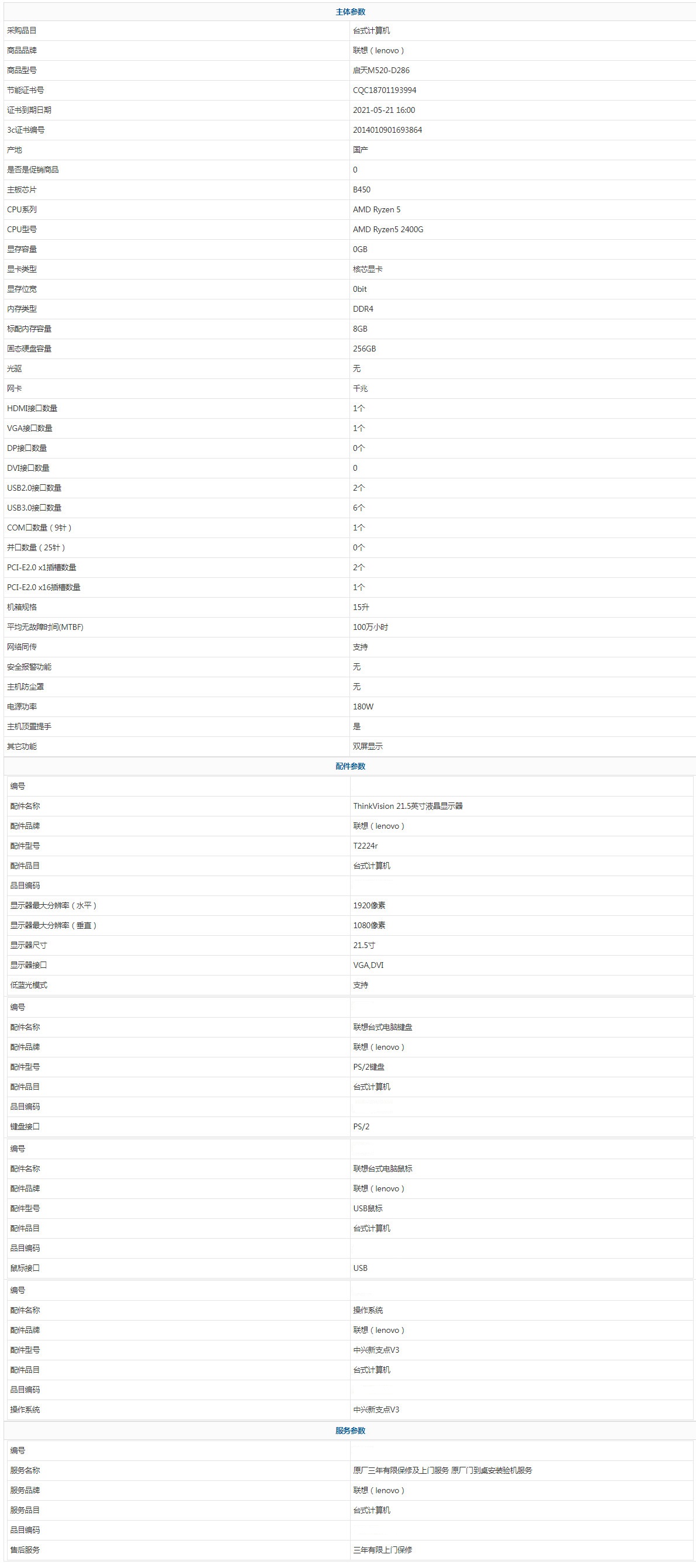 - 商品名稱:聯(lián)想(lenovo) 啟天M520-D286 AMD Ryzen 5 AMD Ryzen5 2400G 8GB 256GB 中興新支點V3 21.5寸 三年有限上門保修