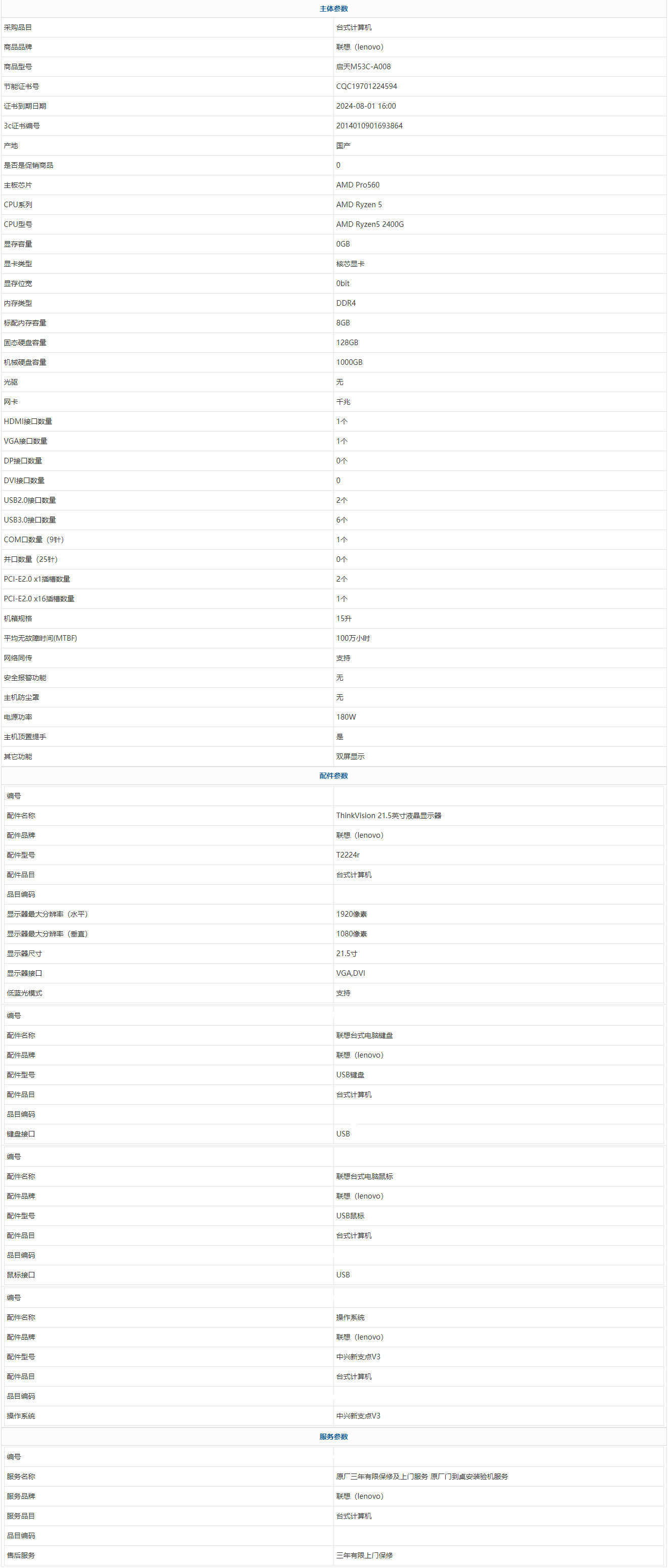 • 商品名稱:聯(lián)想(lenovo) 啟天M53C-A008 AMD Ryzen 5 AMD Ryzen5 2400G 8GB 1000GB 128GB 中興新支點V3 21.5寸 三年有限上門保修