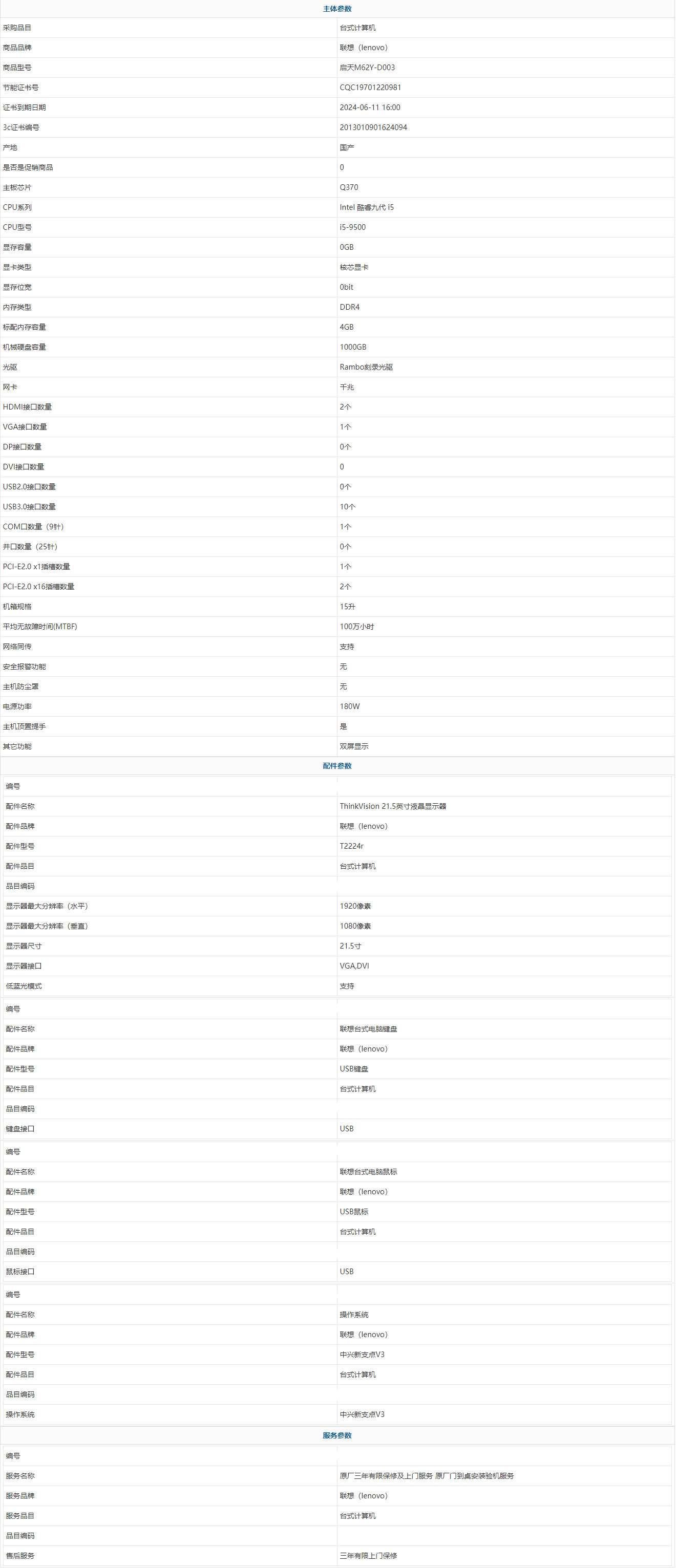 - 商品名稱:聯(lián)想(lenovo) 啟天M62Y-D003 Intel 酷睿九代 i5 i5-9500 4GB 1000GB 中興新支點V3 21.5寸 三年有限上門保修