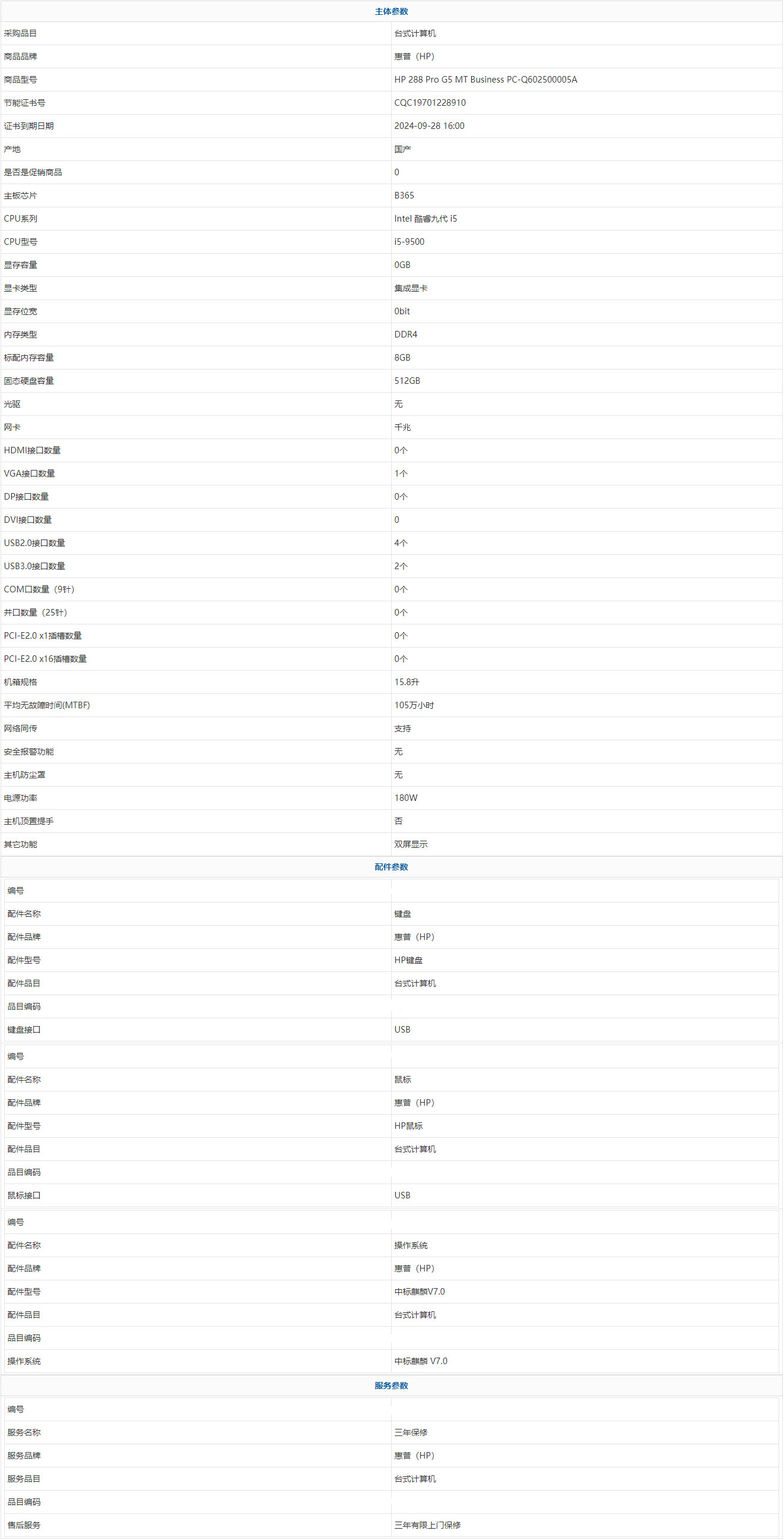 - 商品名稱:惠普(HP) HP 288 Pro G5 MT Business PC-Q602500005A Intel 酷睿九代 i5 i5-9500 8GB 512GB 中標(biāo)麒麟 V7.0 三年有限上門保修