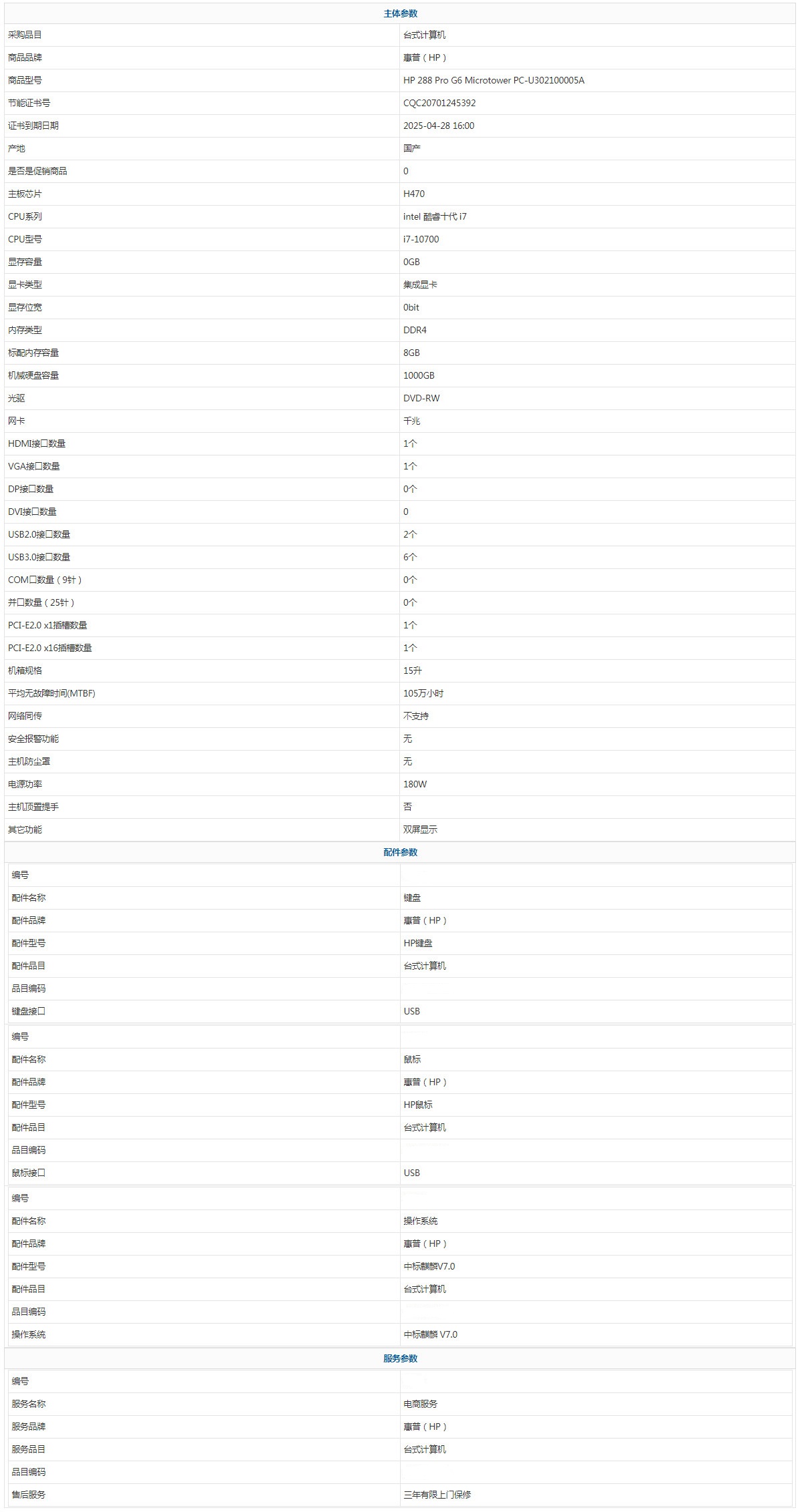 • 商品名稱:惠普(HP) HP 288 Pro G6 Microtower PC-U302100005A intel 酷睿十代 i7 i7-10700 8GB 1000GB 中標麒麟 V7.0 三年有限上門保修