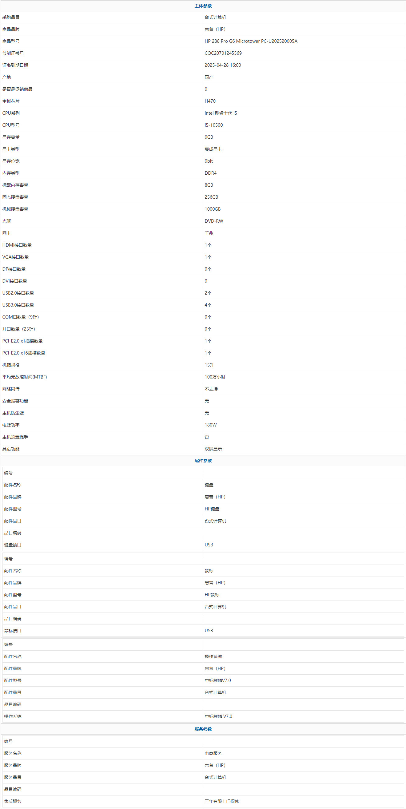 - 商品名稱:惠普(HP) HP 288 Pro G6 Microtower PC-U202520005A intel 酷睿十代 i5 i5-10500 8GB 1000GB 256GB 中標(biāo)麒麟 V7.0 三年有限上門保修