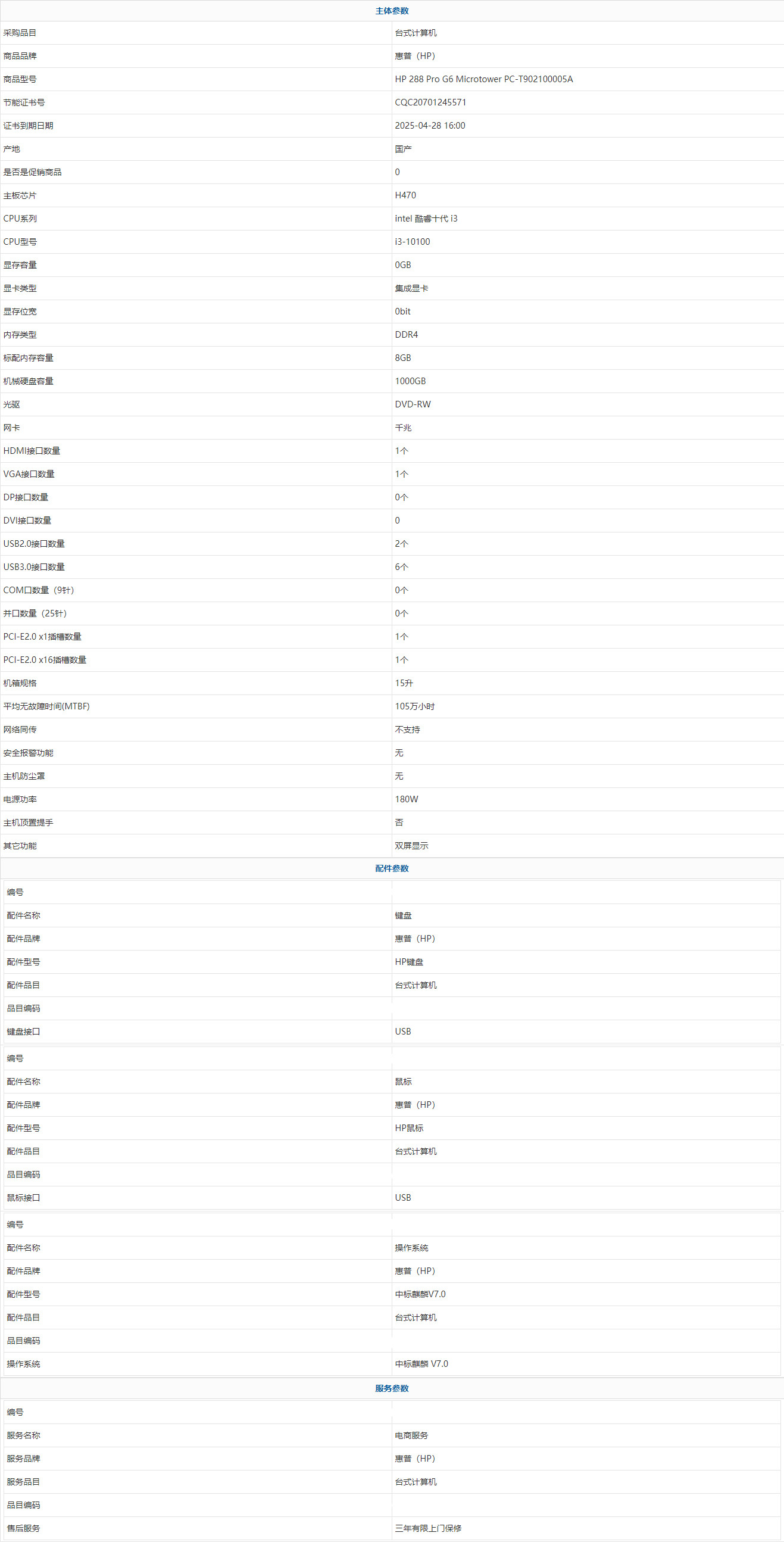 - 商品名稱:惠普(HP) HP 288 Pro G6 Microtower PC-T902100005A intel 酷睿十代 i3 i3-10100 8GB 1000GB 中標(biāo)麒麟 V7.0 三年有限上門保修