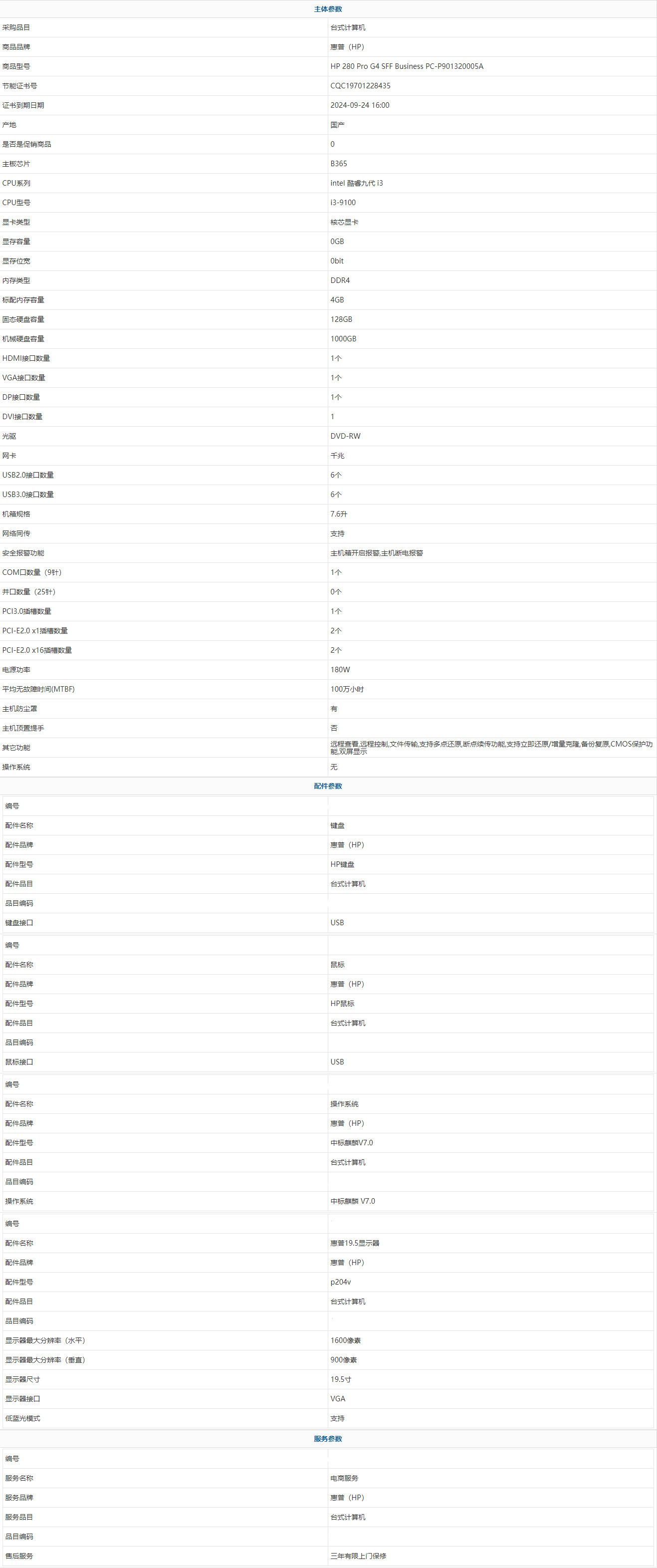 - 商品名稱:惠普(HP) HP 280 Pro G4 SFF Business PC-P901320005A intel 酷睿九代 i3 i3-9100 4GB 1000GB 128GB 中標(biāo)麒麟 V7.0 19.5寸 三年有限上門保修