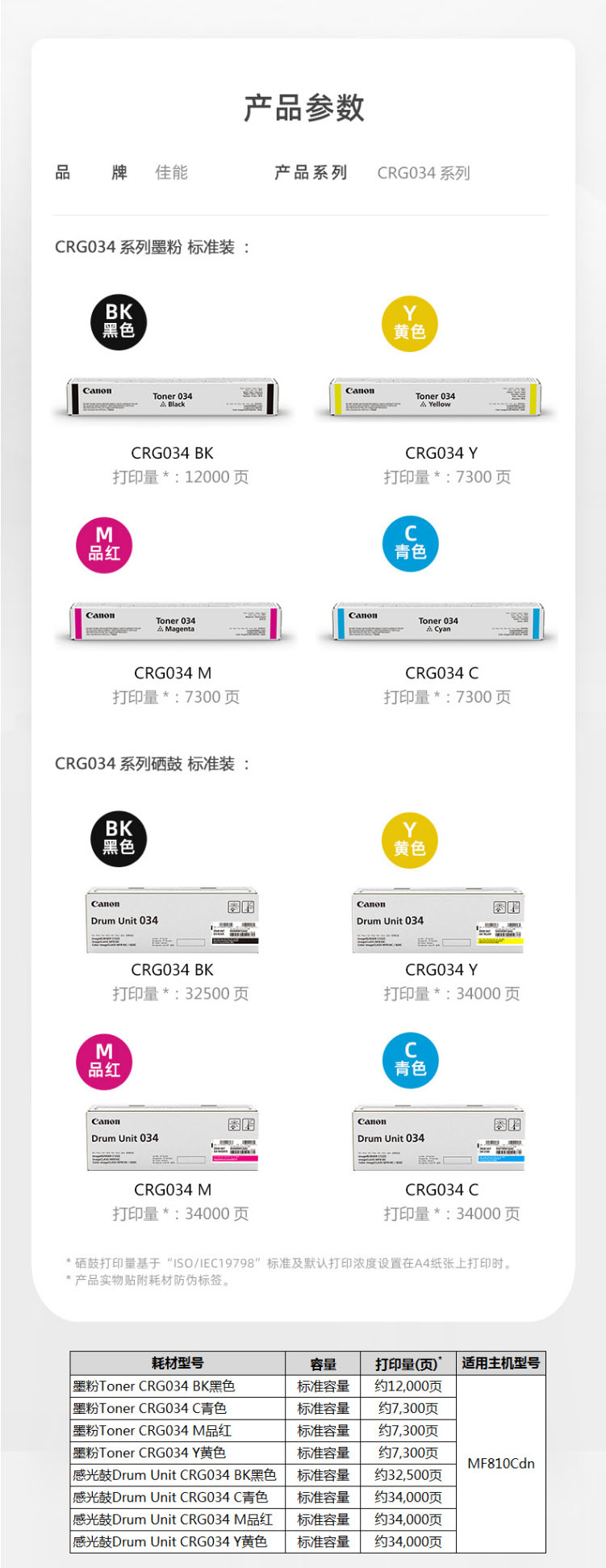 佳能(Canon) TONER 034 Y 黃色墨粉盒 印量約7300頁(yè)