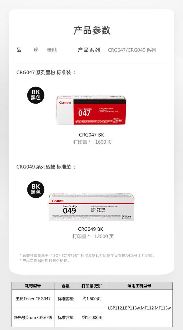 • 商品名稱:佳能(Canon) CRG047 BK 黑色墨粉盒 印量約1600頁
