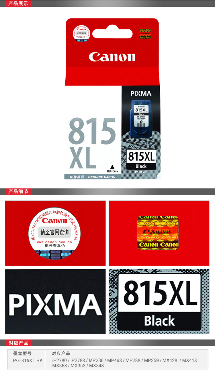 • 商品名稱:佳能(Canon) PG-815XL 大容量黑色墨盒 印量約401頁