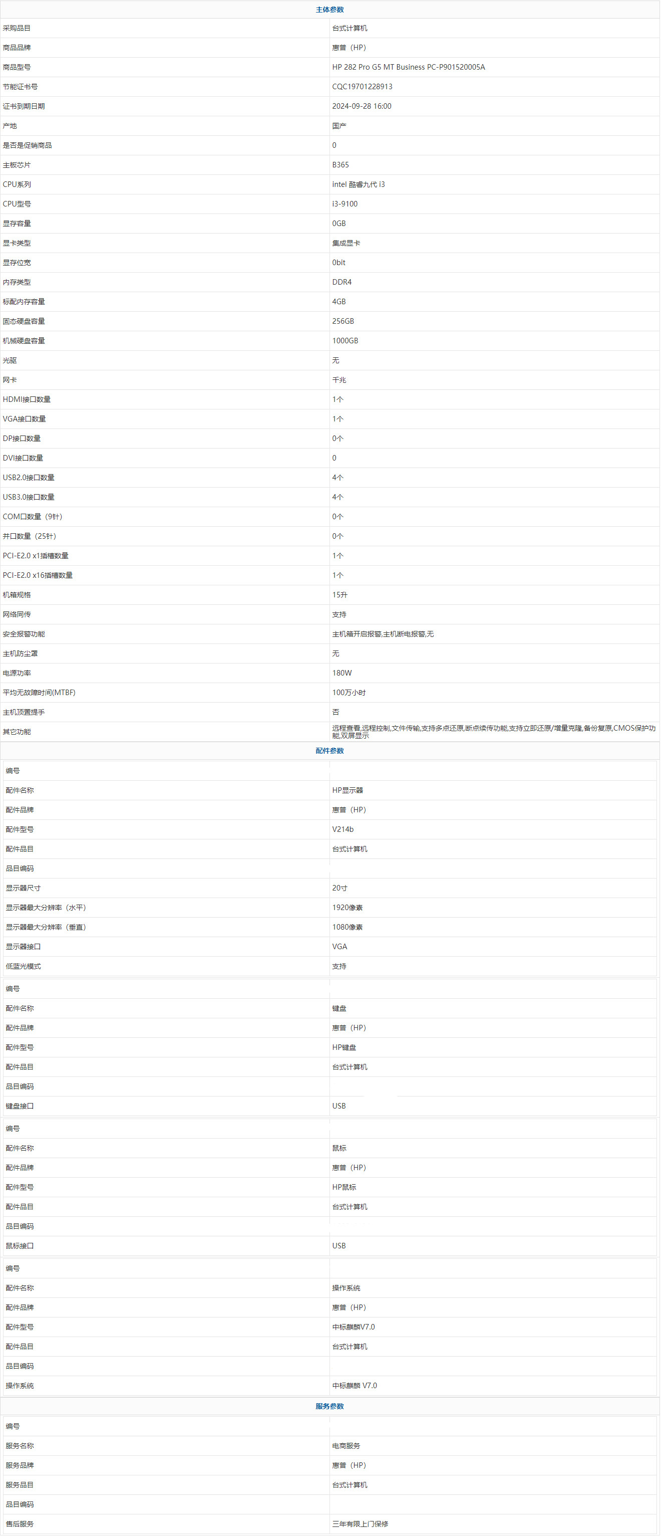- 商品名稱:惠普(HP) HP 282 Pro G5 MT Business PC-P901520005A intel 酷睿九代 i3 i3-9100 4GB 1000GB 256GB 中標(biāo)麒麟 V7.0 20寸 三年有限上門保修