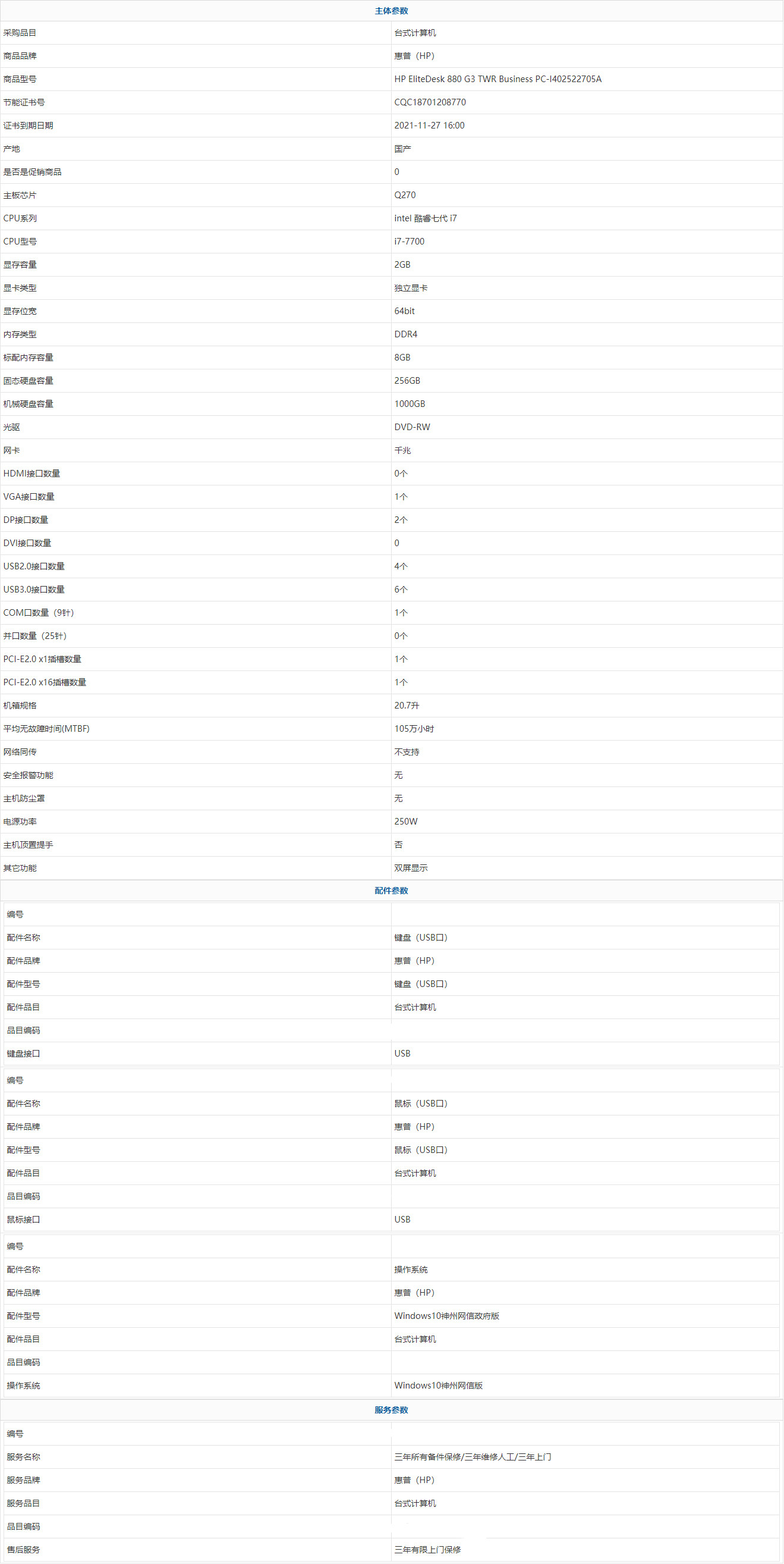 惠普(HP) HP EliteDesk 880 G3 TWR Business PC-I402522705A intel 酷睿七代 i7 i7-7700 8GB 1000GB 256GB Windows10神州網(wǎng)信版 三年有限上門保修