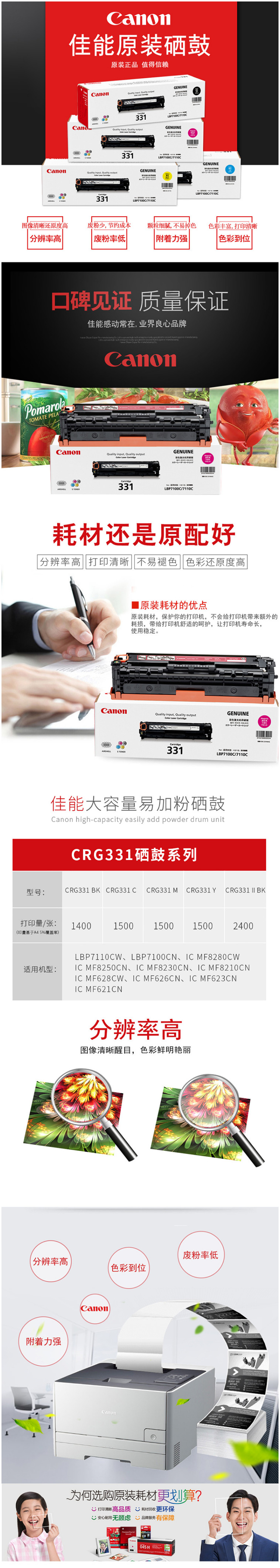 - 商品名稱:佳能(Canon)CRG-331 BK/C/M/Y原裝黑藍(lán)紅黃色硒鼓 四色套裝 適用于LBP7100Cn/LBP7110CW/iC MF8280CW/MF8250CN