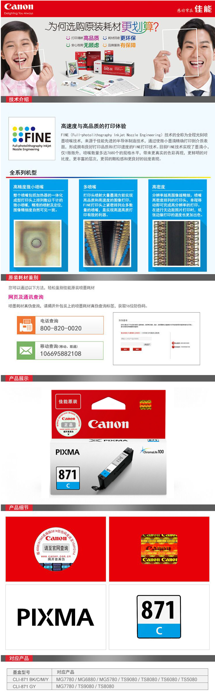 • 商品名稱:佳能(Canon) CLI-871 C 青色墨盒