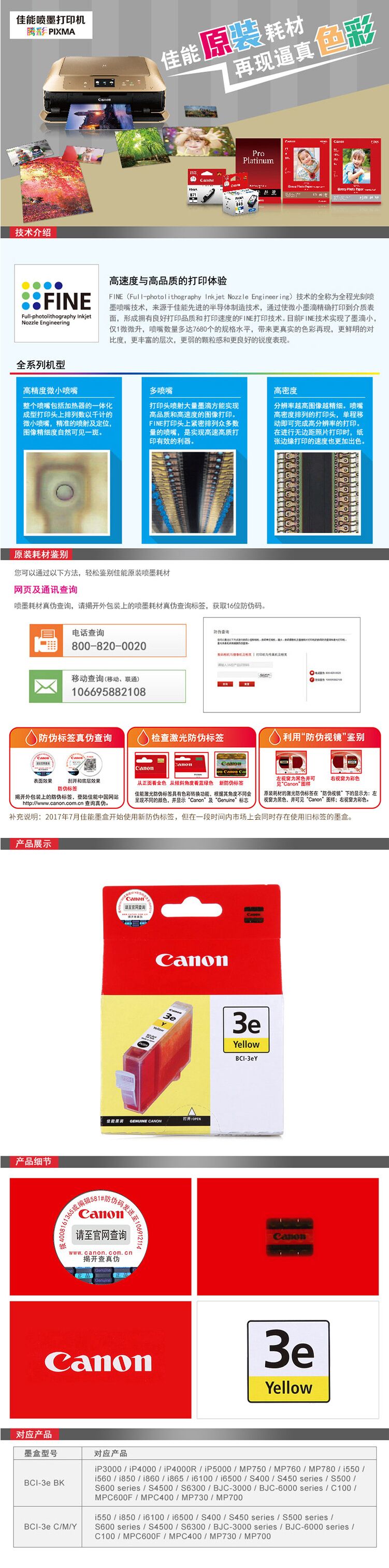 • 商品名稱:佳能(Canon) InkTank BCI-3e Y 黃色墨盒 打印量-頁 適用于i6500/i6100 MP730