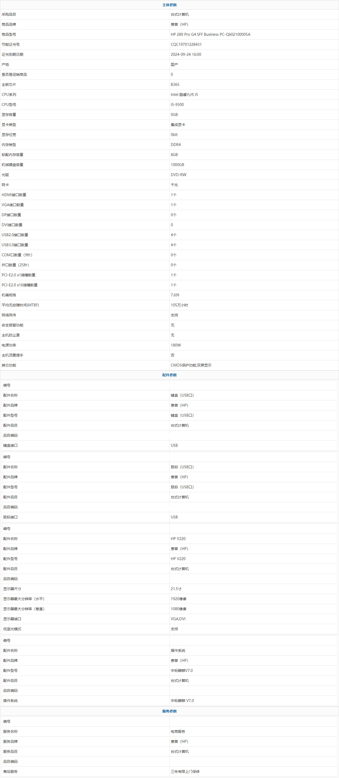 - 商品名稱:惠普(HP) HP 280 Pro G4 SFF Business PC-Q602100005A Intel 酷睿九代 i5 i5-9500 8GB 1000GB 中標麒麟 V7.0 21.5寸 三年有限上門保修