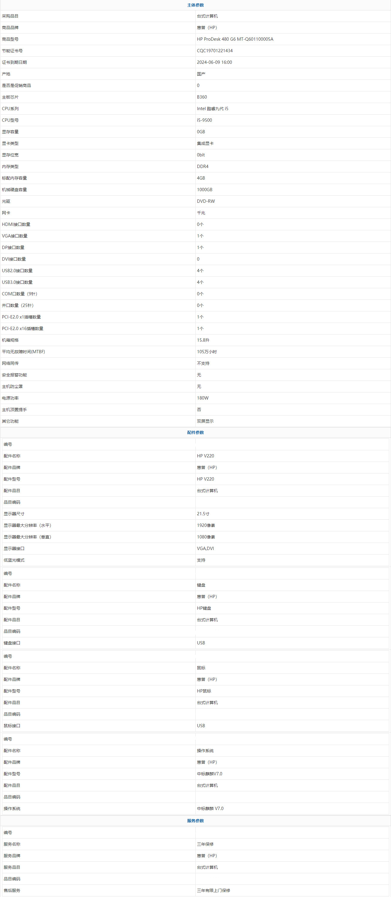 • 商品名稱:惠普(HP) HP ProDesk 480 G6 MT-Q601100005A Intel 酷睿九代 i5 i5-9500 4GB 1000GB 中標(biāo)麒麟 V7.0 21.5寸 三年有限上門保修