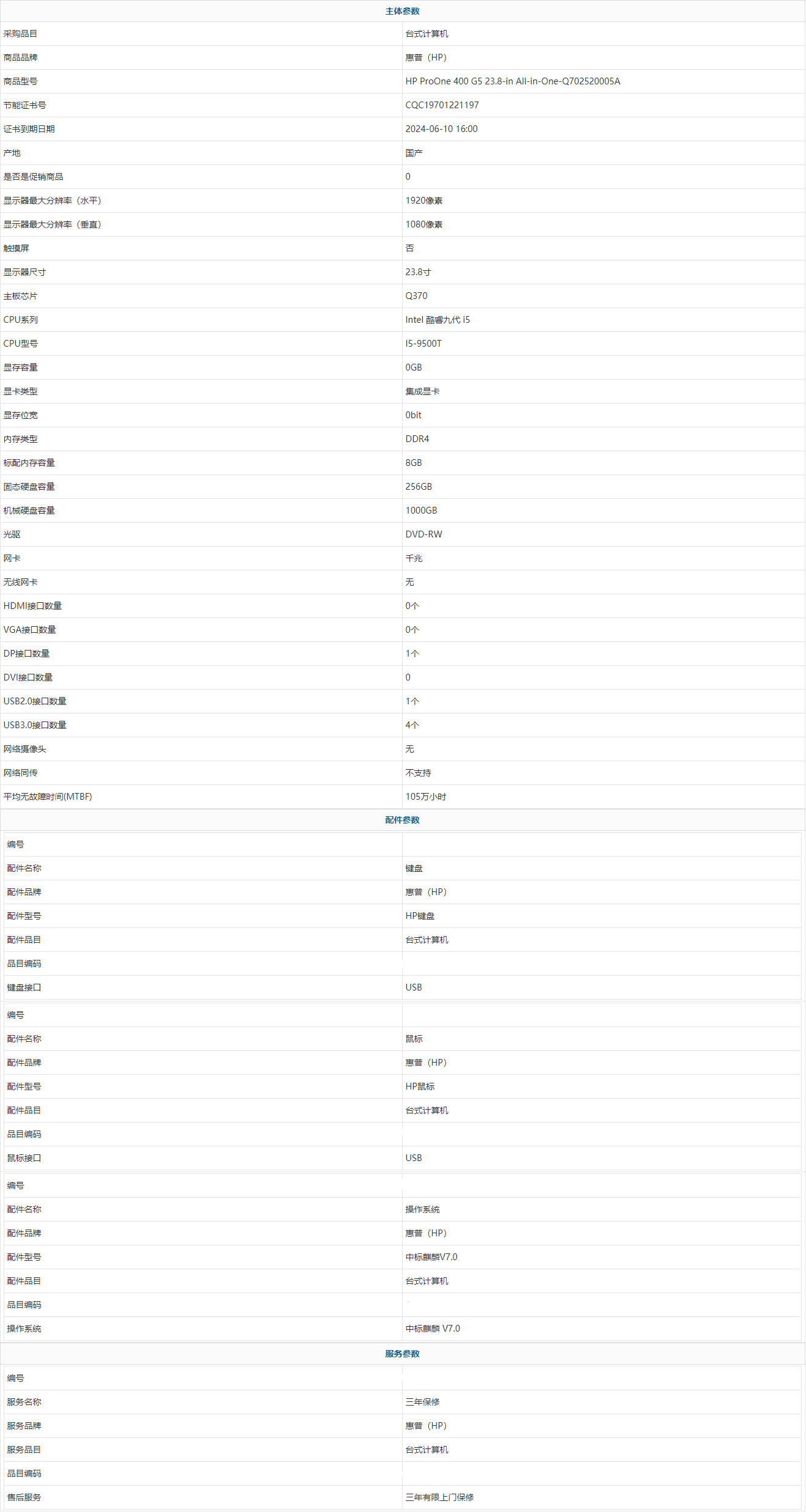 - 商品名稱:惠普(HP) HP ProOne 400 G5 23.8-in All-in-One-Q702520005A Intel 酷睿九代 i5 I5-9500T 8GB 1000GB 256GB 中標(biāo)麒麟 V7.0 23.8寸 三年有限上門保修