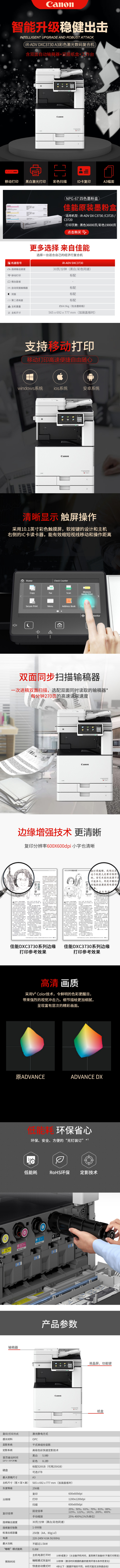 • 商品名稱:佳能(Canon)iR-ADV DXC3730 A3彩色激光數碼復合機 約30頁/分鐘 有線/無線打印 含主機+雙面輸稿器+雙層紙盒 適用耗材:NPG-67墨粉