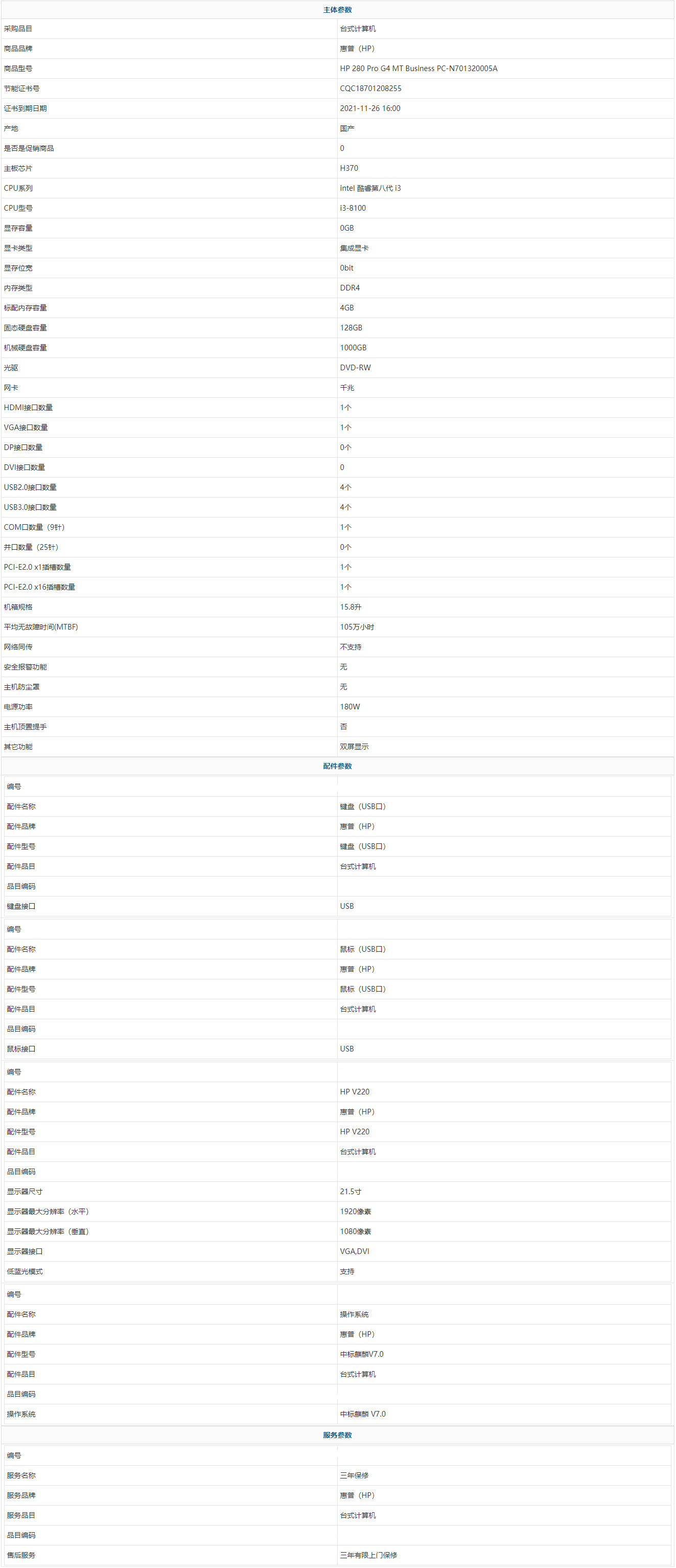 - 商品名稱:惠普(HP) HP 280 Pro G4 MT Business PC-N701320005A intel 酷睿第八代 i3 i3-8100 4GB 1000GB 128GB 中標(biāo)麒麟 V7.0 21.5寸 三年有限上門保修