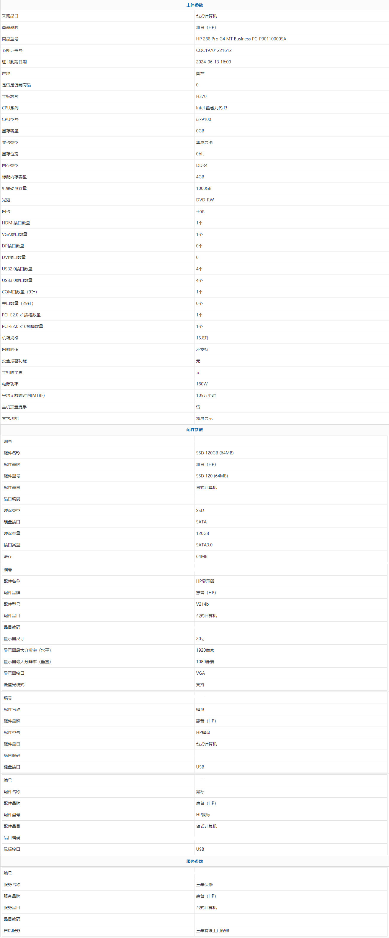 - 商品名稱:惠普(HP) HP 288 Pro G4 MT Business PC-P901100005A intel 酷睿九代 i3 i3-9100 4GB 1000GB 20寸 三年有限上門保修