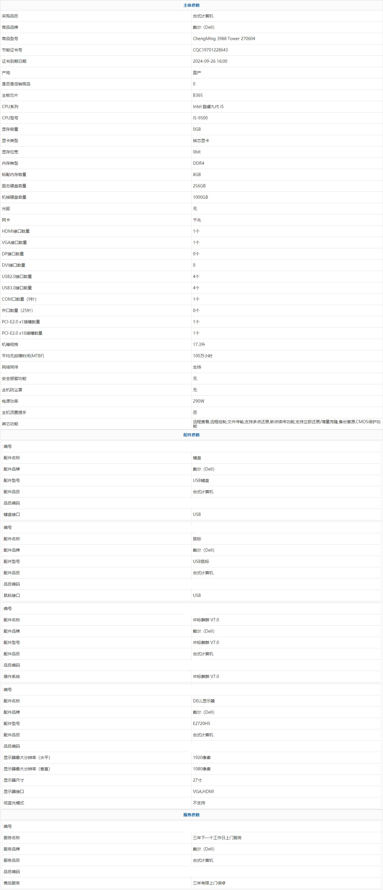 - 商品名稱:戴爾(Dell) ChengMing 3988 Tower 270604 Intel 酷睿九代 i5 i5-9500 8GB 1000GB 256GB 中標(biāo)麒麟 V7.0 27寸 三年有限上門保修